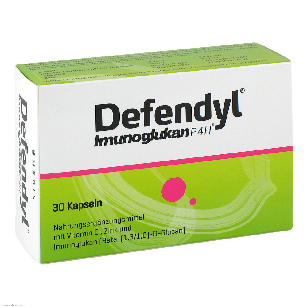 Defendyl-Imunoglukan P4H Kapseln ist ein Nahrungsergänzungsmittel mit Imunoglukan, Vitamin C und Zink. Es stärkt die Abwehrkräfte vor und während der Erkältungssaison und ist auch für mehrmonatige Verwendung ohne Unterbrechung geeignet.Imunoglukan ist ein natürlicher, bioaktiver Stoff, isoliert aus dem Austernpilz.Defendyl wirkt über den Darm auf das Immunsystem, welches oft aufgrund von Stress, Erschöpfung, häufiger Infektionen, Einnahme von Antibiotika oder langwieriger Krankheiten geschwächt ist.Für Erwachsene und Kinder ab 6 Jahren.Die DefendylProdukte sind für die ganze Familie, für Diabetiker und Vegetarier gut geeignet. Sie sind gluten- und laktosefrei.