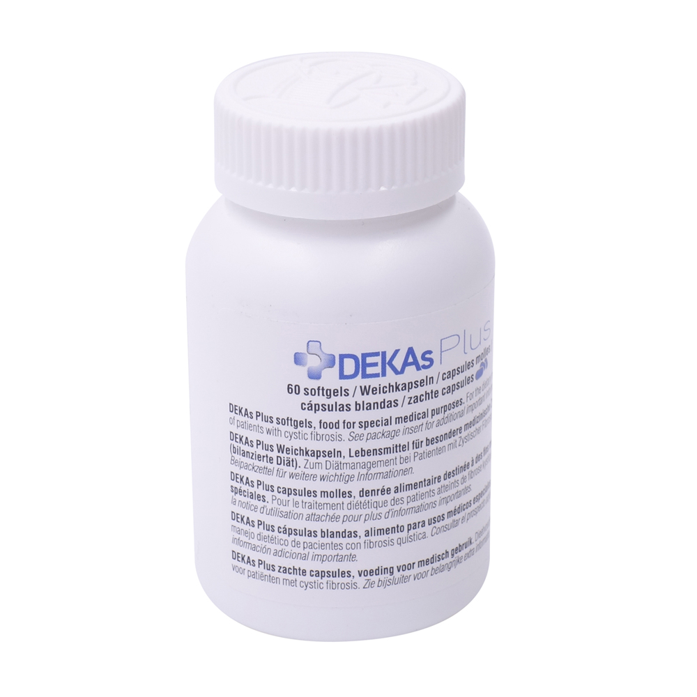 Dekas Plus Weichkapseln sind Lebensmittel für besondere medizinische Zwecke, welche sich zum Diätmanagement bei Patienten mit Mukoviszidose eignen. Das Multivitamin-Mineral-Ergänzungspräparat enthält höhere Mengen an fettlöslichen Vitaminen. Das Produkt basiert auf einer klinisch geprüften Freisetzungs-Technologie, die die Aufnahme von fettlöslichen Vitaminen und Nährstoffen verbessern soll.
