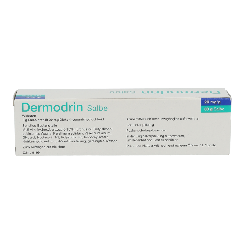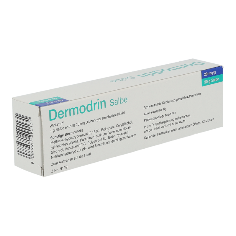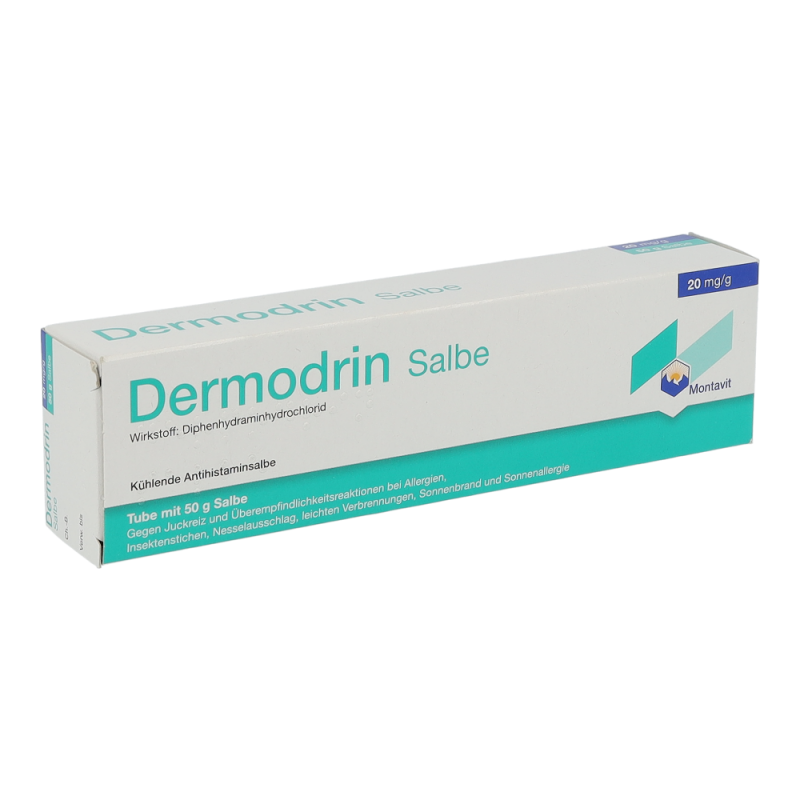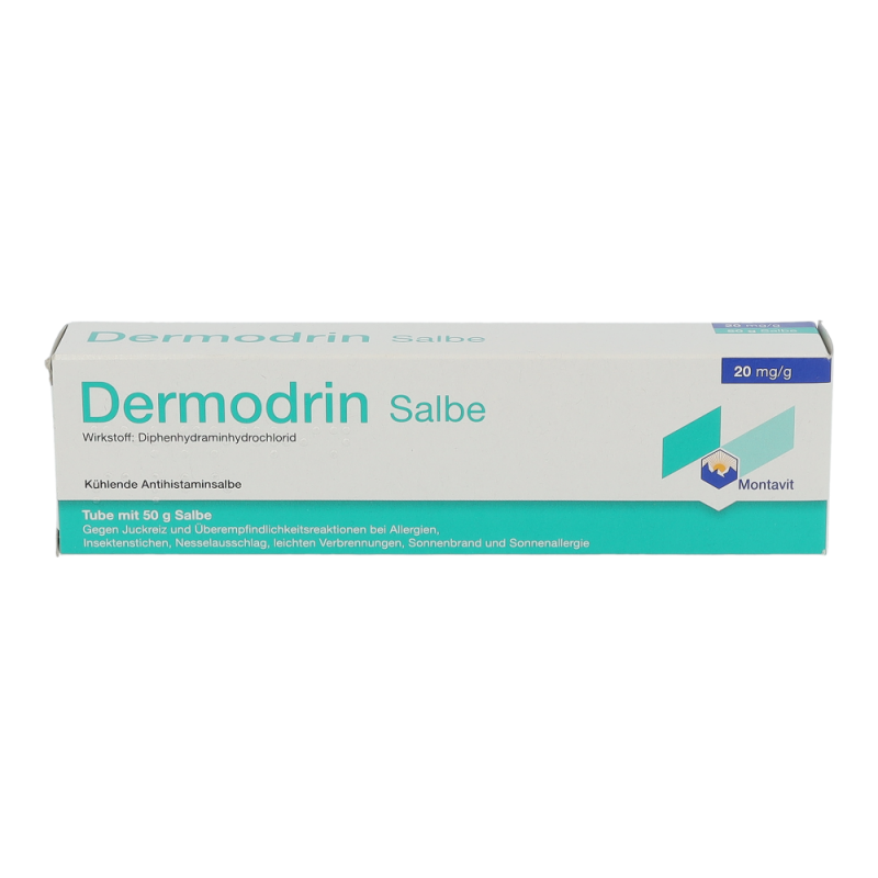 Dermodrin ist eine Antihistaminsalbe. Sie wirkt antiallergisch, juckreizstillend und kühlend und wird angewendet zur Behandlung von Juckreiz, lokalen Schmerzen und Überempfindlichkeitsreaktionen der Haut bei Allergien, Insektenstichen, Ekzemen, Nesselausschlag, juckenden Wundrändern und Hautabschürfungen, leichten Verbrennungen sowie Sonnenbrand und juckenden Hautausschlägen nach Sonnenbestrahlung (Sonnenallergie).
