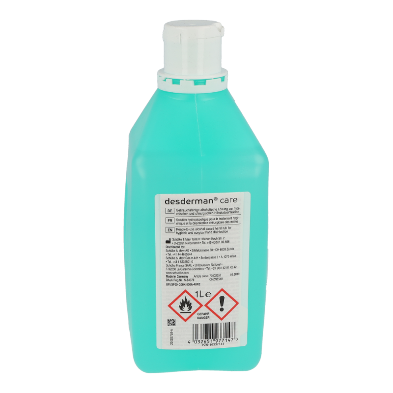 desderman care Händedesinfektion ist ein viruzides Desinfektionsmittel mit besonders hautfreundlicher Pflegeformel und eignet sich zur hygienischen sowie zur chirurgischen Händedesinfektion. Es ist farbstoff- und parfümfrei und dermatologisch getestet.