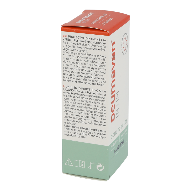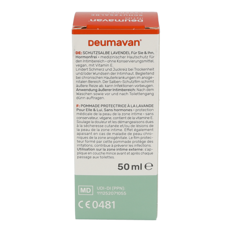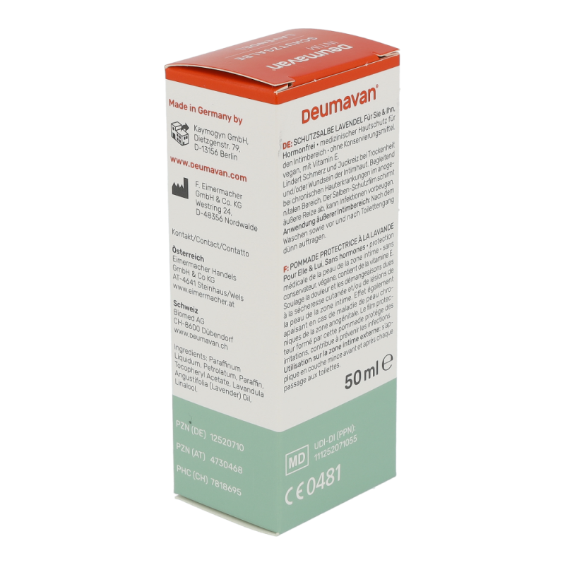 Deumavan Schutzsalbe schützt, regeneriert und pflegt die sensible Intimhaut. Sie mindert Schmerzen, Brennen, Juckreiz und andere Intimbeschwerden und unterstützt die Intimhaut, wenn sie trocken, rau, geschädigt oder infolge einer Erkrankung besonders empfindlich ist. Die Rezeptur enthält kein Wasser (Aqua), weshalb sie ohne Konservierungsmittel (z. B. Parabene) und ohne Emulgatoren auskommt. Zudem enthält sie keinen Alkohol. Daher verursacht Deumavan Schutzsalbe kein Brennen auf der zarten Intimhaut und trocknet diese bei täglicher Anwendung nicht aus. Deumavan Schutzsalbe enthält Vitamin E, ist frei von Hormonen und vegan. Alle Bestandteile der fettreichen Deumavan-Rezeptur sind hochgereinigt und entsprechen pharmazeutischen Qualitätsstandards.