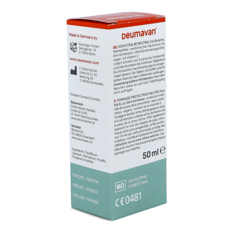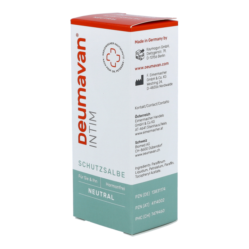 Deumavan® Schutzsalbe neutral (und lavendel) ist ein Produkt ohne Zusatzstoffe, d.h. ohne Emulgatoren, Stabilisatoren, Parabenen oder andere Konservierungsstoffe und zudem wasserfrei. Die Deumavan® Intimpflegeprodukte werden als Salben hergestellt, d.h. wasserfreie Fette und Öle, und nicht als Creme. Cremes als Gemische aus Wasser und Fett/Öl können nicht ohne die genannten Emulgatoren, Parabene und andere Konservierungsstoffe hergestellt werden.