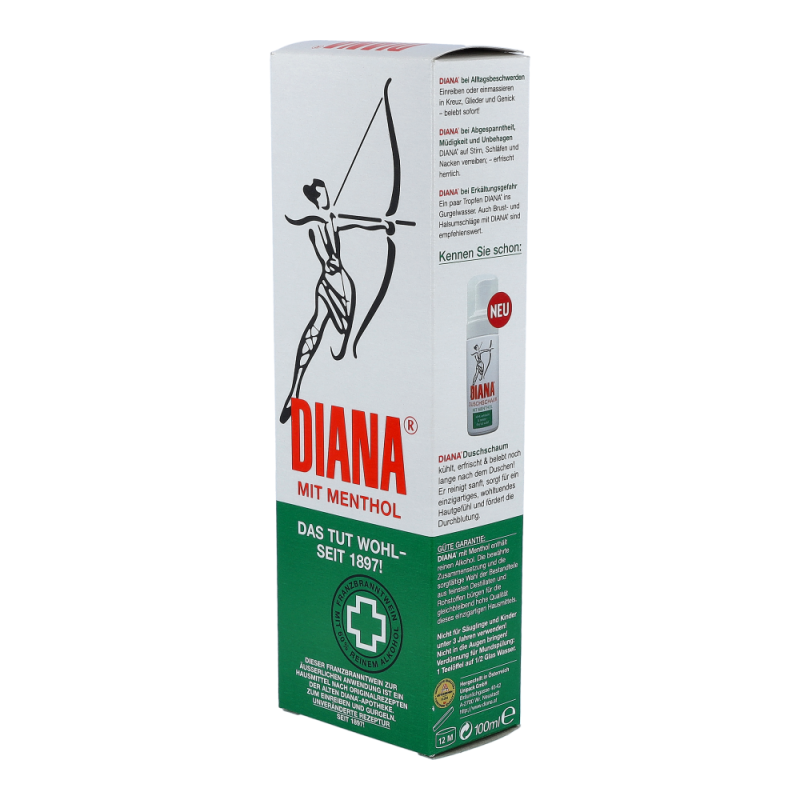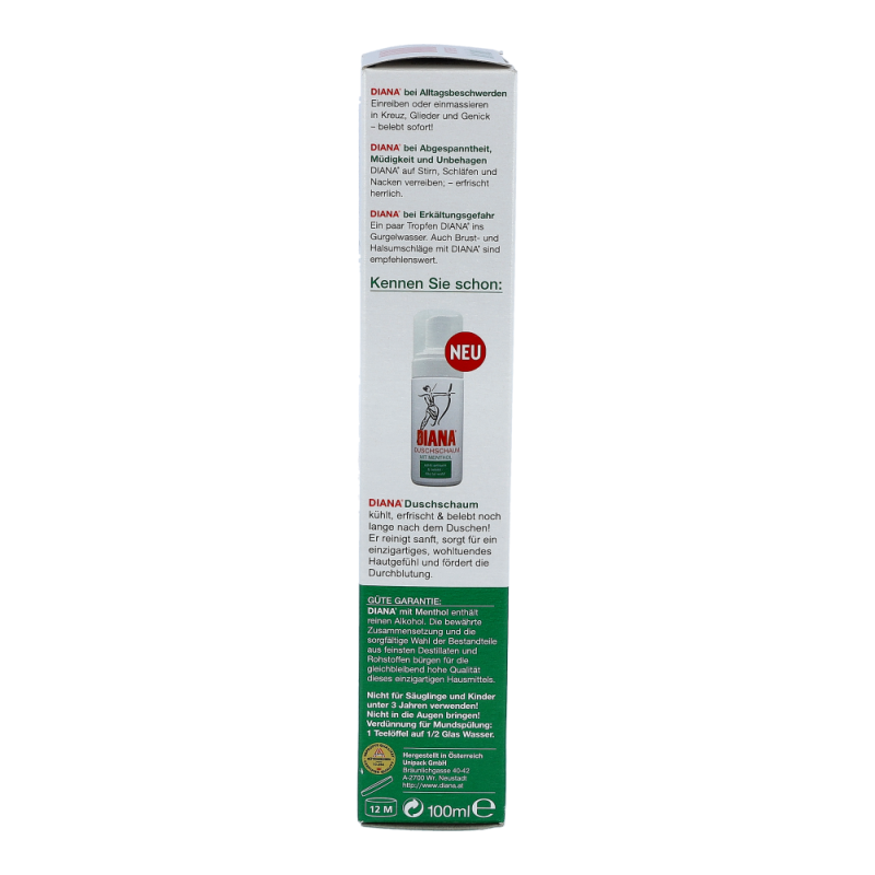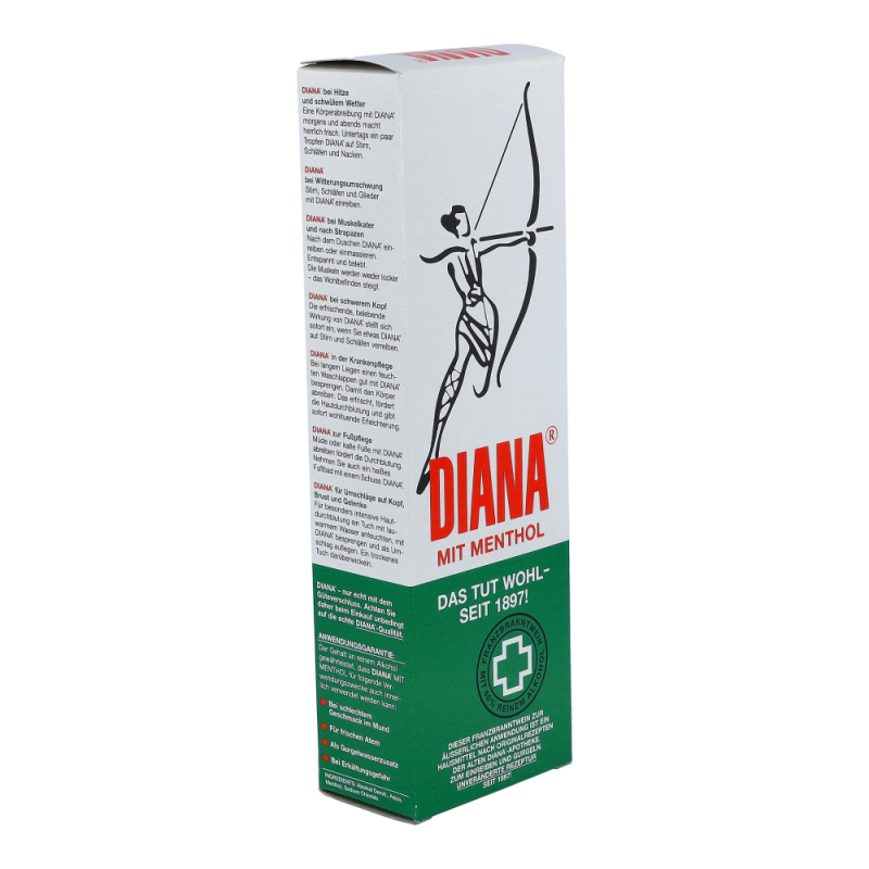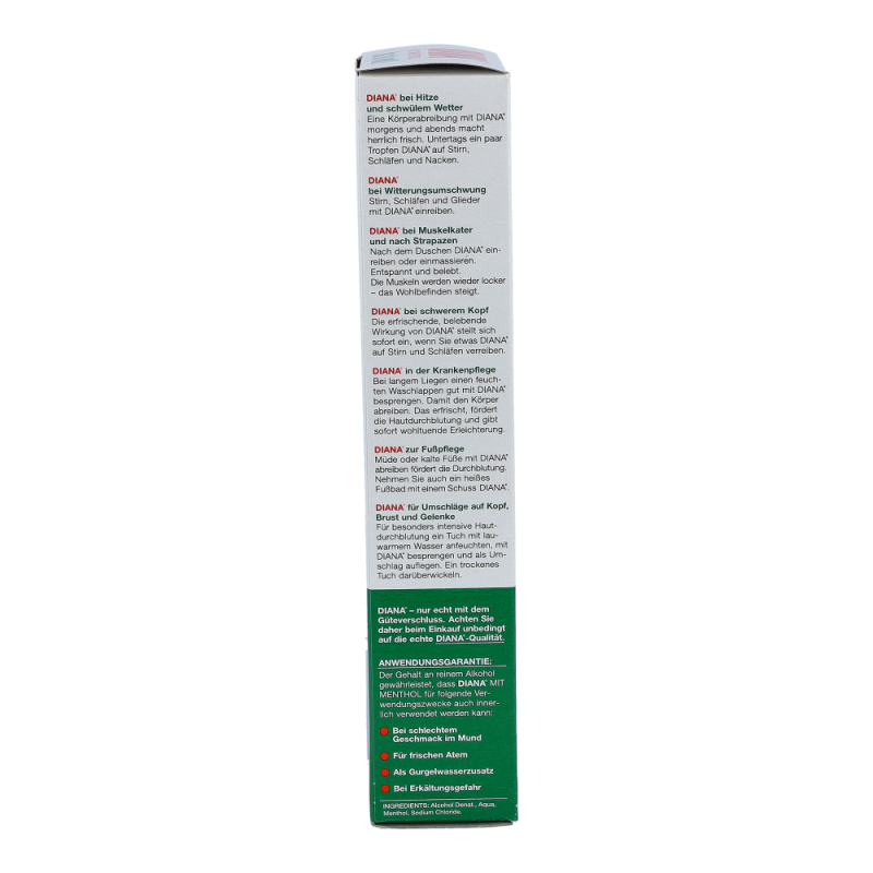 DianaFranzbranntwein kühlt mit erfrischendem Menthol bei Hitze und schwülem Wetter,bei Witterungsumschwung und schwerem Kopf. Diana mit Menthol enthält reinenAlkohol.