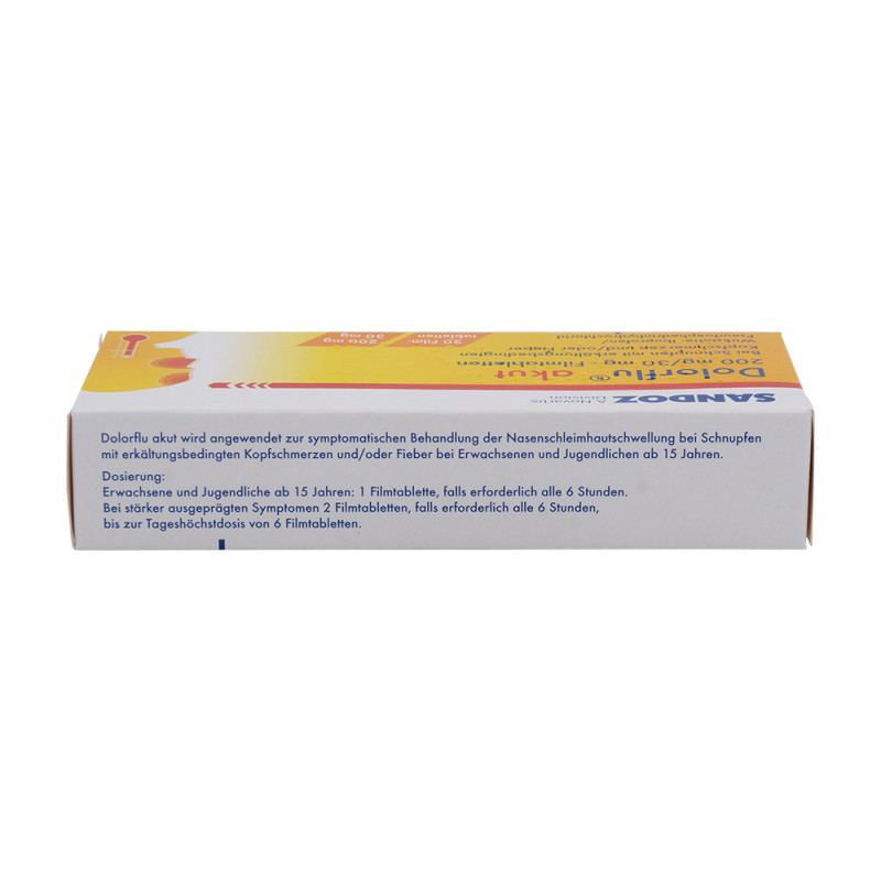 Dolorflu akut 200mg/30 mg Filmtabletten 20 Stk. hilft mit dem Wirkstoff Ibuprofen bei Schnupfen mit erkältungsbedingten Kopfschmerzen und/oder Fieber.
