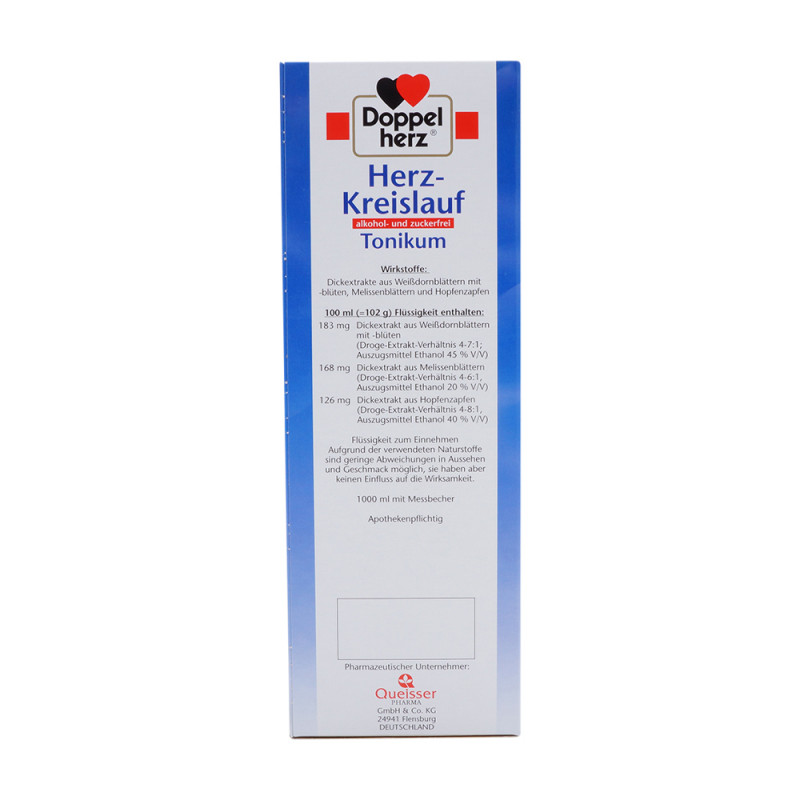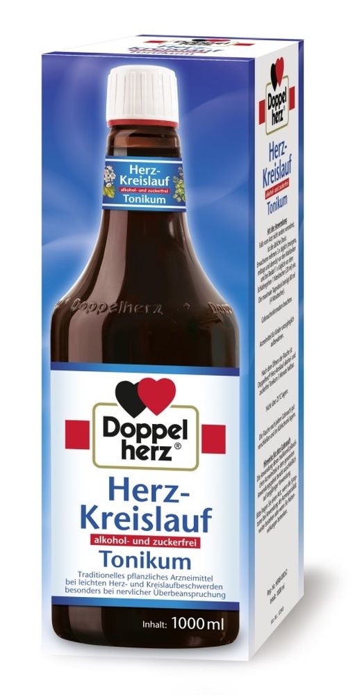 Doppelherz Herz Tonikum alkoholfrei und zuckerfrei stärkt Herz und Kreislauf bei nervlicher Belastung mit der Naturkraft der Kräuter. Das Vital Tonikum Herz-Kreislauf von Doppelherz nutzt die Kraft ausgewählter Heilpflanzen, um den Körper zu stärken und den Ablauf der wichtigen Lebensfunktionen zu unterstützen. Die spezielle Kombination wertvoller Zubereitungen aus Weißdorn, Rosmarin und Baldrian wirkt vorbeugend, stärkt Herz und Kreislauf, insbesondere bei nervlicher Belastung. Dieses Produkt ist erhältlich in den Packungsgrößen 500 ml und 1 l.