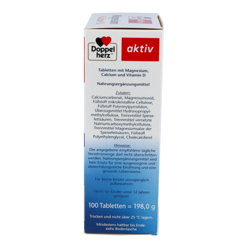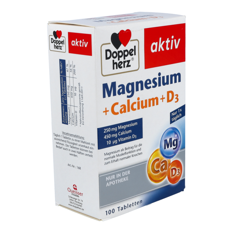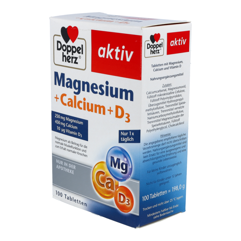Ein guter und ausgewogener Nährstoff- und Vitaminhaushalt ist für den Körper lebensnotwendig. Magnesium gehört zu den wichtigen Mineralstoffen für unseren Organismus. Die Speicherung von Magnesium ist allerdings nur begrenzt möglich. Bei Sport, nach starker körperlicher Belastung oder bei einer unausgewogenen Ernährung ist es wichtig, den Körper reichlich zu versorgen. Das Nahrungsergänzungsmittel von Doppelherz mit Magnesium eignet sich zur Unterstützung der Nährstoffversorgung. Neben Magnesium, das einen Beitrag zur normalen Muskelfunktion leistet, enthalten die Tabletten zusätzlich Calcium und Vitamin D für den normalen Knochenerhalt. Täglich kann eine Tablette zu einer Mahlzeit unzerkaut und mit ausreichend Flüssigkeit eingenommen werden.