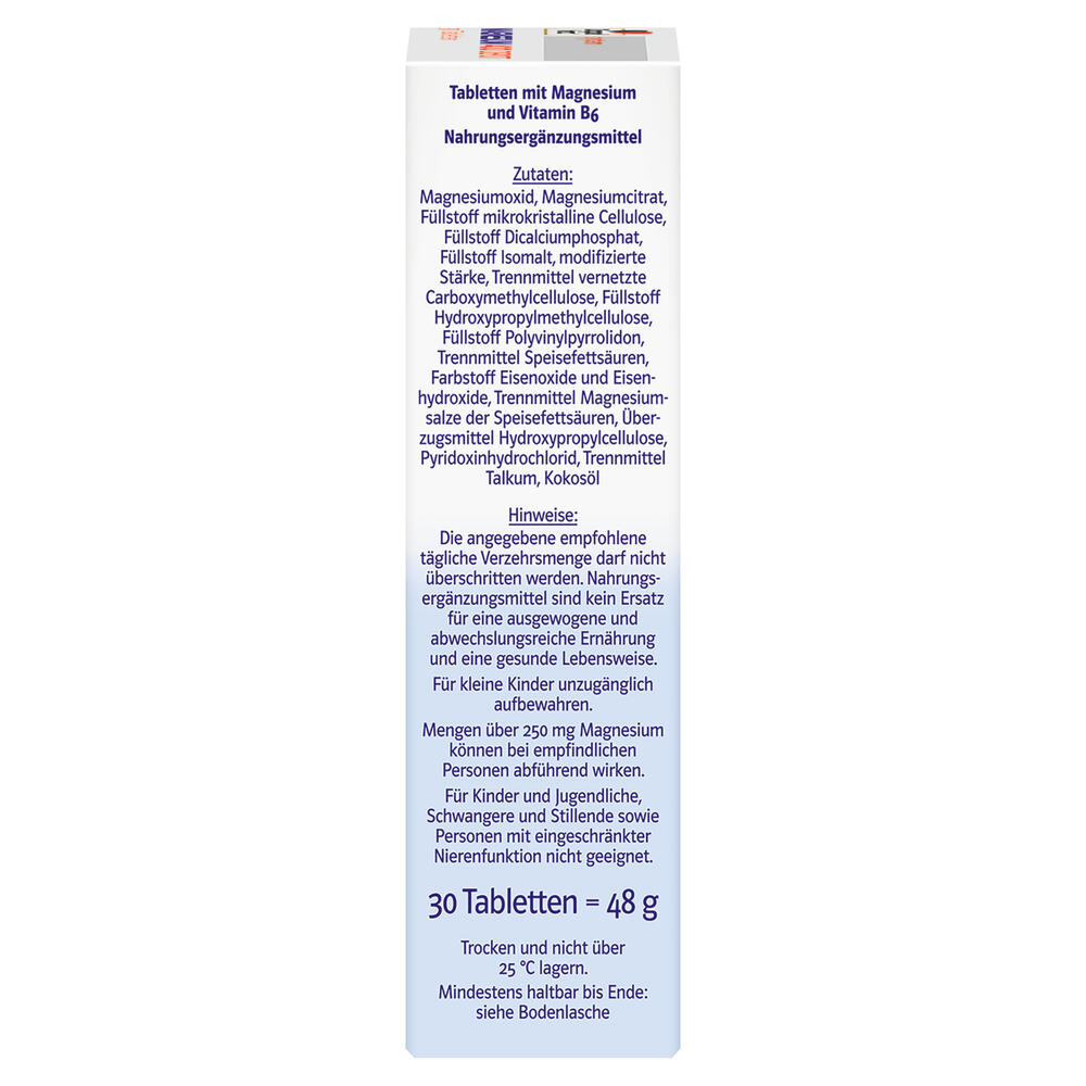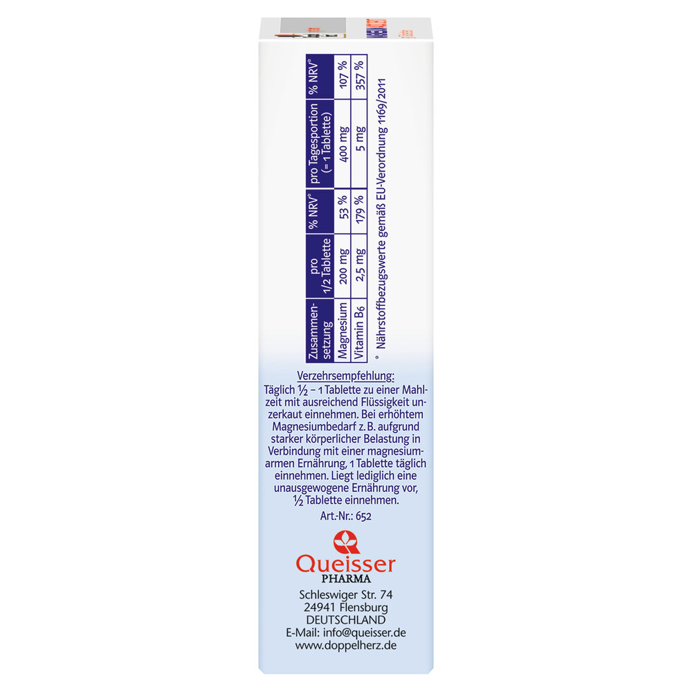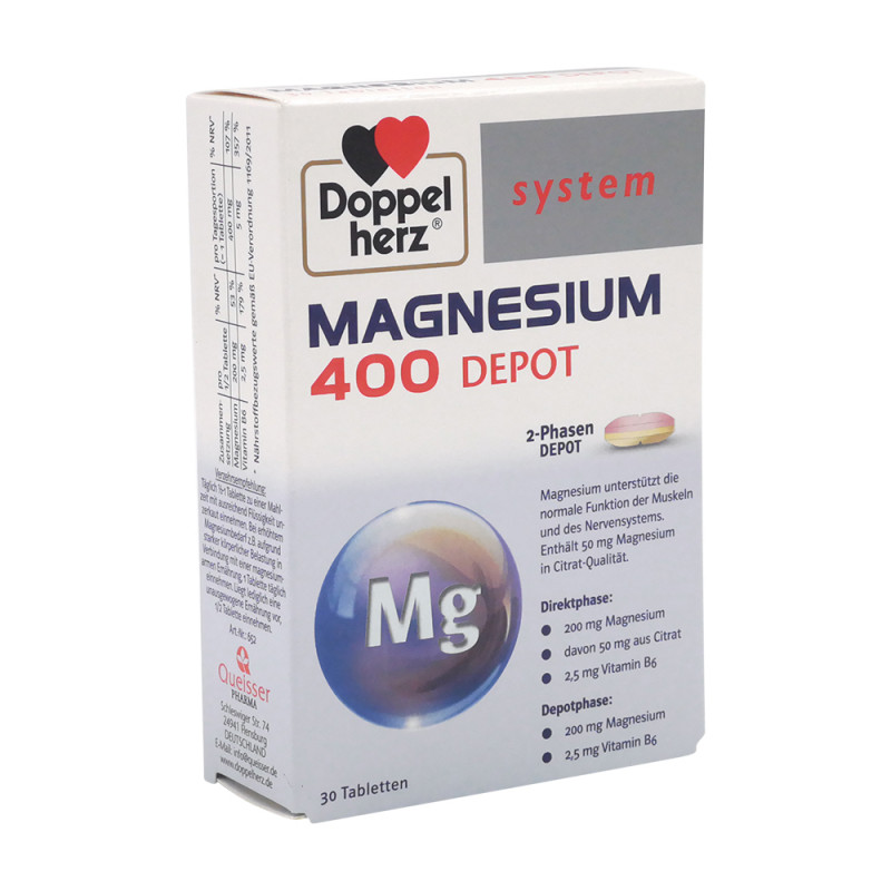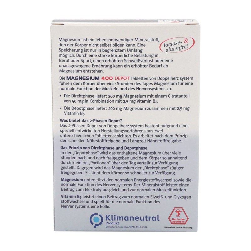 Die MAGNESIUM 400 DEPOT Tabletten von Doppelherz system führen dem Körper über viele Stunden des Tages Magnesium für eine normale Funktion der Muskeln und des Nervensystems zu: Die Direktphase liefert 200 mg Magnesium mit einem Citratanteil von 50 mg in Kombination mit 2,5 mg Vitamin B6. Die Depotphase liefert 200 mg Magnesium zusammen mit 2,5 mg Vitamin B6. Das 2-Phasen Depot von Doppelherz system besteht aufgrund eines speziell entwickelten Herstellungsverfahrens aus zwei unterschiedlichen Tablettenschichten. Es arbeitet nach dem Prinzip der schnellen Nährstofffreigabe und Langzeit-Nährstofffreigabe. In der „Depotphase“ wird das enthaltene Magnesium über viele Stunden nach und nach freigegeben und dem Körper so anhaltend durch kleinere „Portionen“ über den Tag verteilt zur Verfügung gestellt. Dagegen wird das Magnesium der „Direktphase“ zügiger freigegeben. Es steht dem Körper so schneller zur Verfügung. Magnesium unterstützt den normalen Energiestoffwechsel sowie die normale Funktion des Nervensystems. Der Mineralstoff leistet einen Beitrag zum Elektrolytausgleich und zur normalen Muskelfunktion. Vitamin B6 leistet einen Beitrag zum normalen Eiweiß- und Glykogenstoffwechsel und spielt für die normale Funktion des Nervensystems eine Rolle.