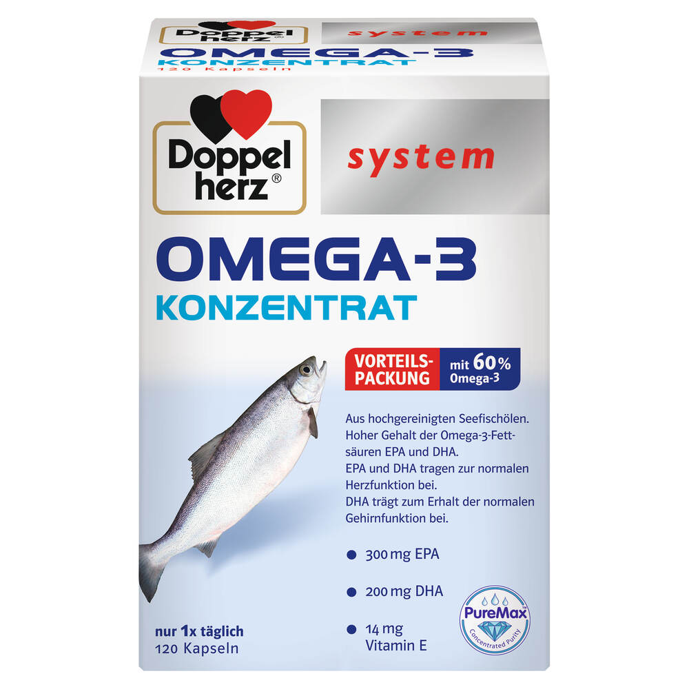 Omega-3-Fettsäuren sind ein wichtiger Bestandteil einer gesunden Ernährung. Die Omega-3-Fettsäuren EPA/DHA tragen bei einer täglichen Aufnahme von 250 mg zur Aufrechterhaltung einer normalen Herzfunktion bei. DHA leistet bei einer Aufnahme von 250 mg täglich zudem auch einen Beitrag zum Erhalt einer normalen Gehirnfunktion sowie zum Erhalt der normalen Sehkraft. Die wichtigen Vertreter der Omega-3-Fettsäuren sind die Eicosapentaensäure (EPA) und die Docosahexaensäure (DHA), die im Körper nicht ohne Vorstufen selbst gebildet werden können. Aber nur wenige Lebensmittel enthalten diese wertvollen Fettsäuren. Aufgrund der hohen Konzentration an Omega-3-Fettsäuren verringert sich die Einnahmemenge der Kapseln. So deckt bereits 1 Kapsel Doppelherz system OMEGA-3 KONZENTRAT mit 300 mg EPA und 200 mg DHA täglich den besonderen Bedarf in verschiedenen Lebenssituationen. Das zusätzlich enthaltene fettlösliche Vitamin E trägt zum Schutz der Zellen vor oxidativem Stress bei. Zur Omega-3 Konzentrat-Gewinnung werden nur Fische verwendet, die aus nachhaltiger Fischerei stammen.