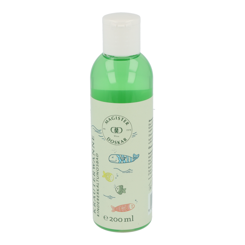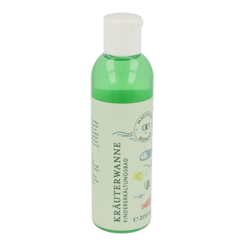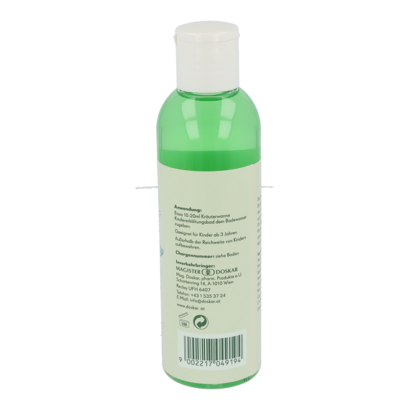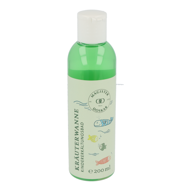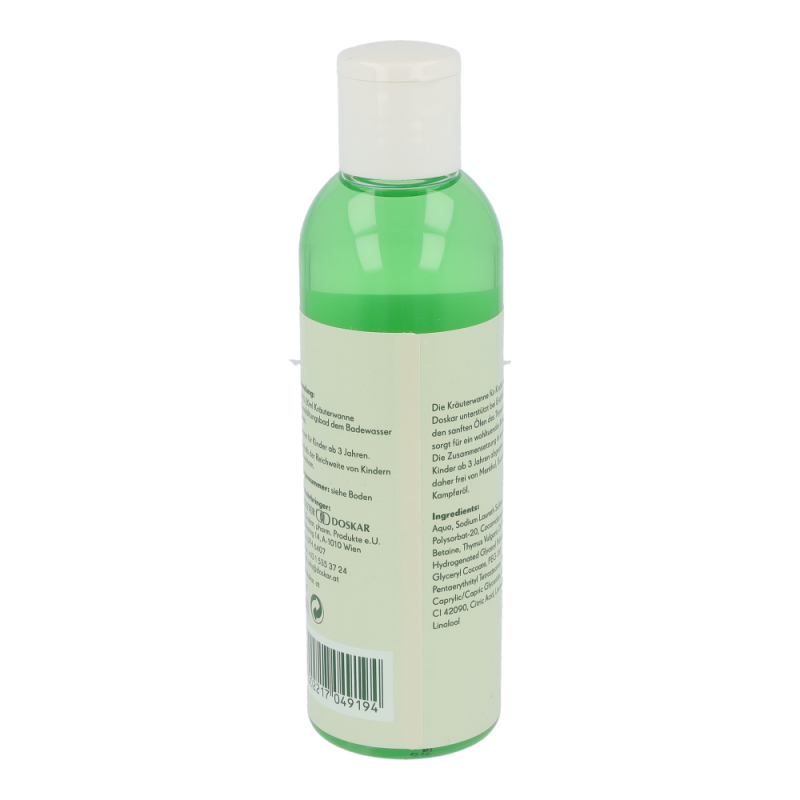 Doskar Kräuterwanne Kindererkältungsbad 200 ml jetzt auch als Kindererkältungsbad mit wertvollem Thymianöl. Der echte Thymian (Thymus vulgaris) wird unter anderem bei Erkältungskrankheiten und Atemwegsinfekten verwendet und ist als Öl wichtiger Inhaltsstoff in unserer Kräuterwanne für Kinder. Die Zusammensetzung ist speziell auf Kinder ab 3 Jahren abgestimmt und daher frei von Menthol, Eucalypthus und Kampferöl.