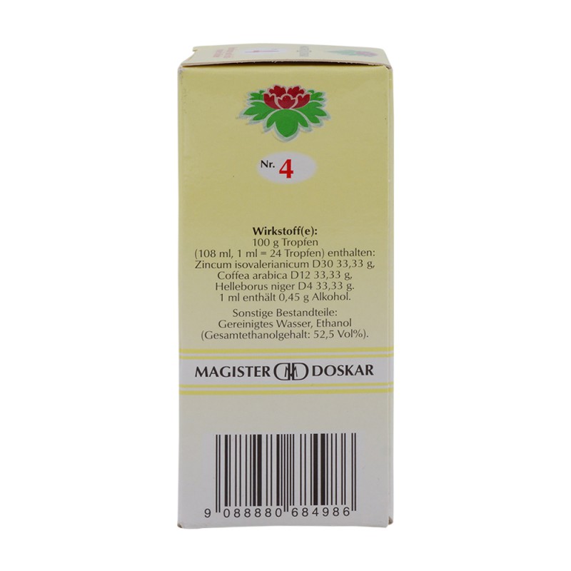Die einzelnen Bestandteile von Nr. 4 Beruhigungs- und Schlaftropfen für Kinder “ Mag. Doskar“ üben einen regulierenden und vegetativ stabilisierenden Effekt auf das zentrale Nervensystem, besonders auf das Schlafzentrum.