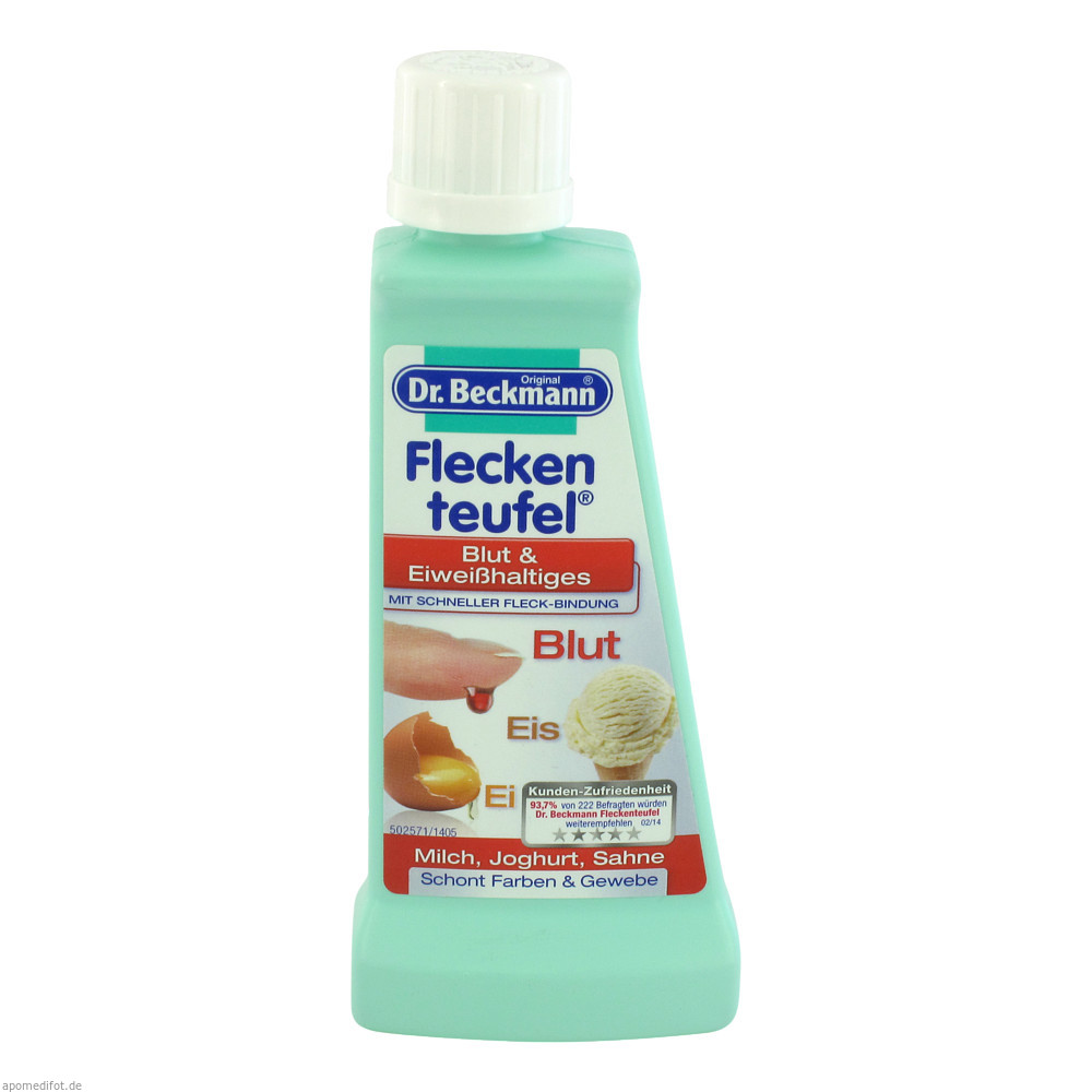 Dr. Beckmann Fleckenteufel Blut/Eiweißhältige Flecken arbeitet mit einer aktiven Fleck-Bindungs-Formel auf enzymatischer Basis. Die enthaltenen Enzyme sind hochwirksame Eiweiße und funktionieren nach dem Schlüssel-Schloss-Prinzip. Entfernt sowohl Flecken von Blut, Eis, Ei, Milch, Joghurt und Sahne als auch Eiter- und Spermaflecken.