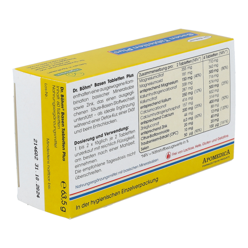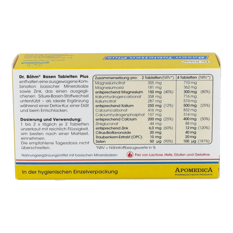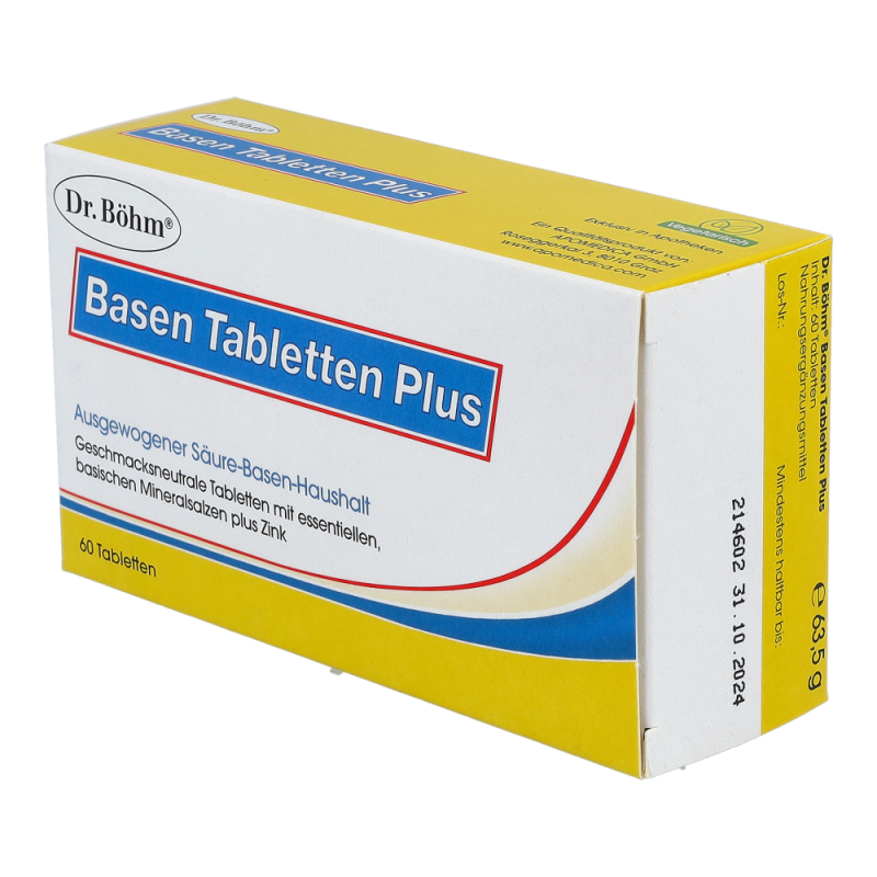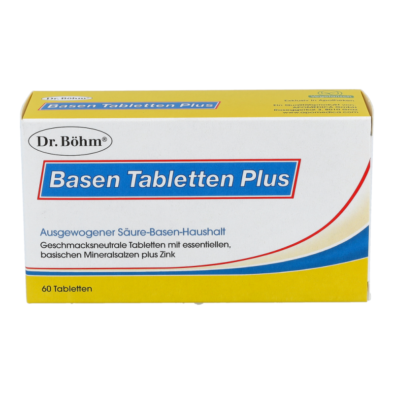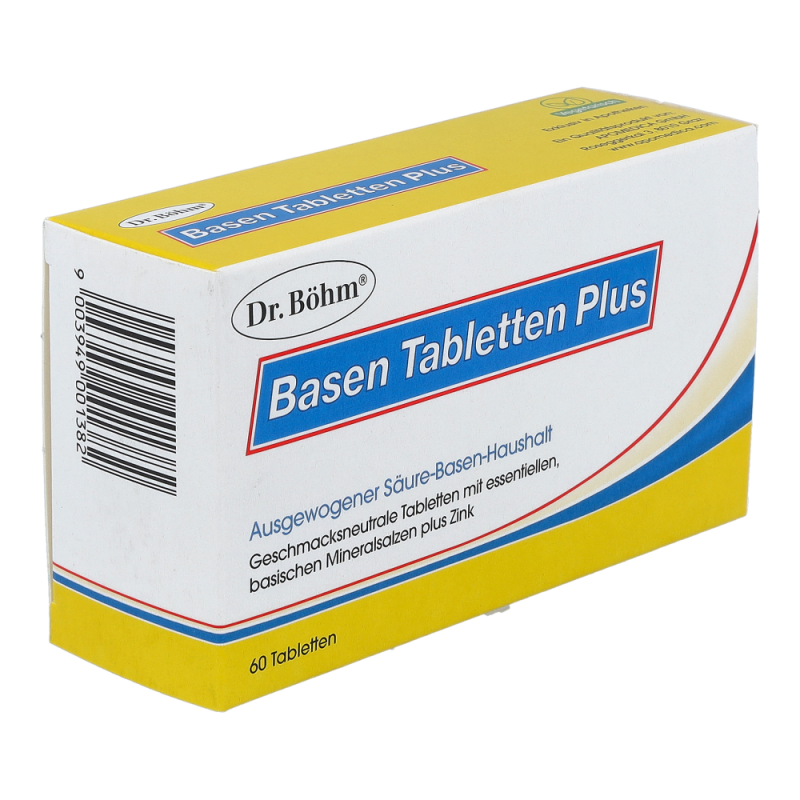 Dr. Böhm Basen Tabletten Plus wirken Übersäuerung entgegen und tragen zu einem normalen Säure-Basen-Stoffwechsel bei. Ideal während einer Diät zur Gewichtsreduktion und beim Entschlacken.