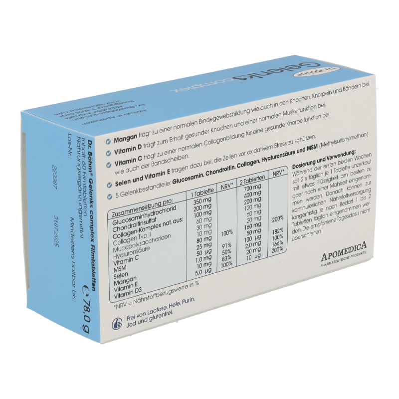 Sie wollen längerfristig etwas für Ihre Beweglichkeit tun? Dann setzen Sie auf Gelenknährstoffe von innen. Dr. Böhm® Gelenks complex versorgt Sie mit einer innovativen Kombination aus Vitaminen und Mikronährstoffen. Zusätzlich enthalten sind fünf elementare Gelenk- und Knorpelbestandteile.