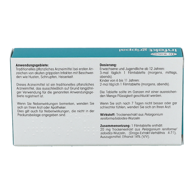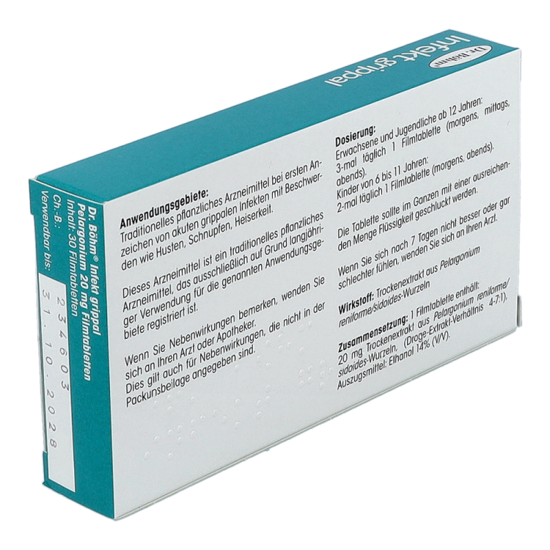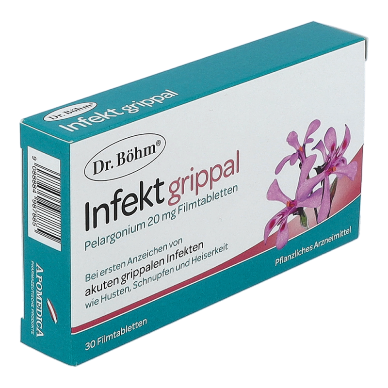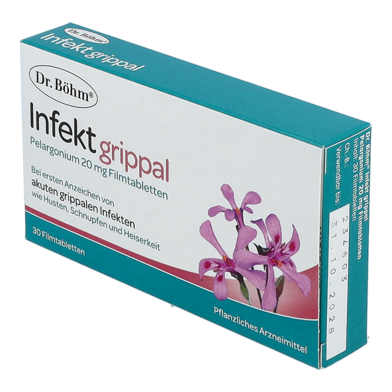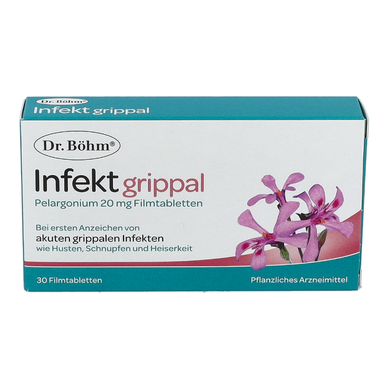 Die ersten Erkältungssymptome machen sich bemerkbar: Es kratzt im Hals, die Nase beginnt zu rinnen… Jetzt gilt: Husten, Heiserkeit und Schnupfen behandeln, bevor es zu spät ist und sich die Symptome verstärken. Hausmittel bei Erkältung oder pflanzliche Medikamente bei grippalen Infekten sind daher sehr gefragt. Das Expertenteam von Dr. Böhm® hat aus diesem Grund Dr. Böhm® Infekt grippal Pelargonium entwickelt: Das pflanzliche Arzneimittel enthält den optimal dosierten Extrakt der Kapland-Pelargonie und kommt bei ersten Anzeichen von akuten grippalen Infekten (Erkältungskrankheiten) mit Symptomen wie Husten, Schnupfen, Heiserkeit zum Einsatz. Die hochwertigen Filmtabletten sind bereits für Kinder ab 6 Jahren geeignet. Damit bietet Dr. Böhm® Infekt grippal Pelargonium natürliche Erste Hilfe bei grippalen Infekten für die ganze Familie.
