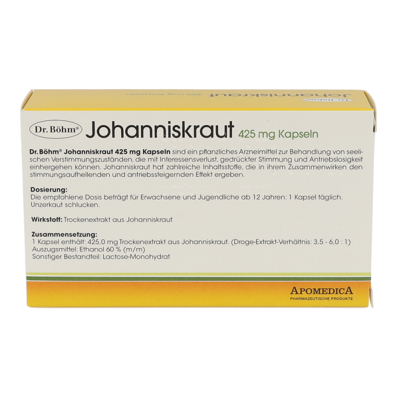 Dr. Böhm Johanniskraut Kapseln dienen der Behandlung von nervlichen und körperlichen Beschwerden ohne erkennbaren Ursachen, Verstimmungszuständen, Niedergeschlagenheit, Angst und nervöser Unruhe.