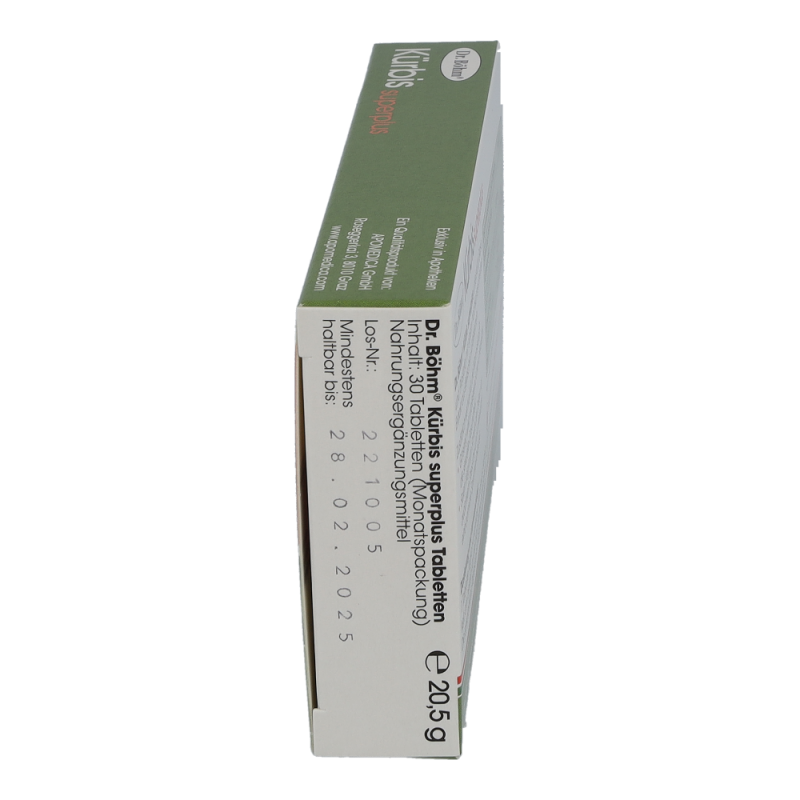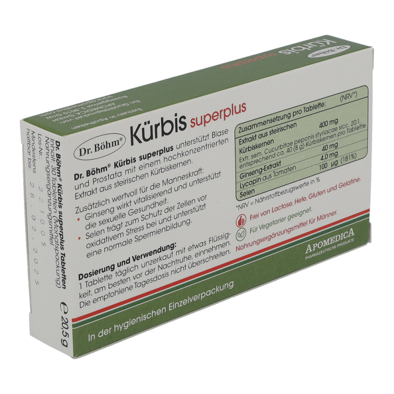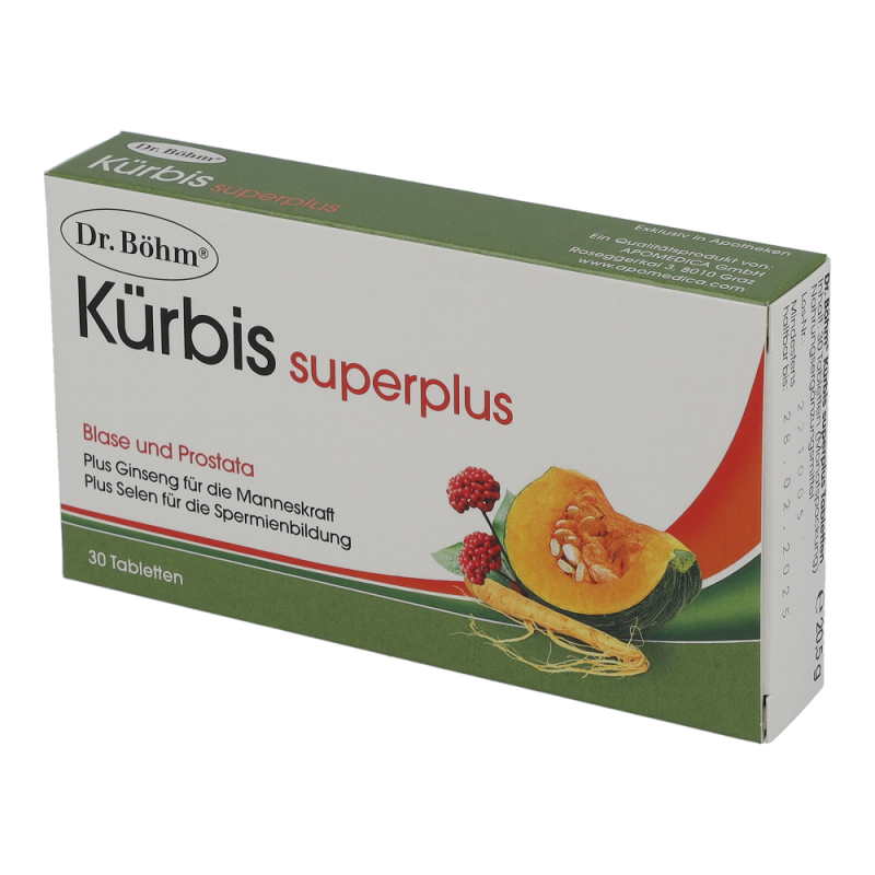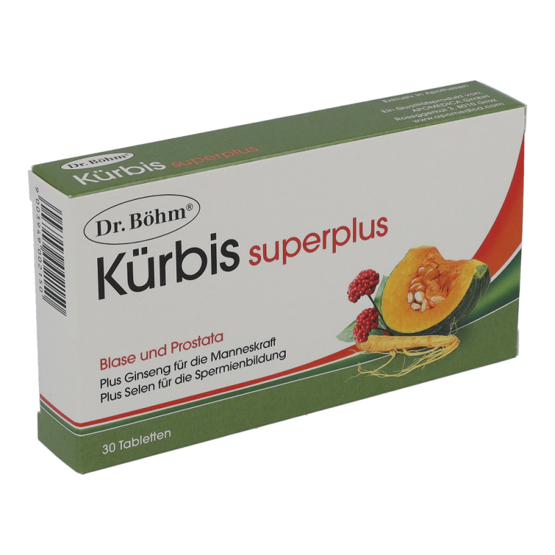 Dr. Böhm Kürbis Superplus Tabletten wurden zur Unterstützung von Blase, Prostata und Vitalfunktion des Mannes entwickelt. Das enthaltene Extrakt aus Kürbiskernen wirkt sich besonders positiv auf die Harnwege und die Prostata des Mannes aus.