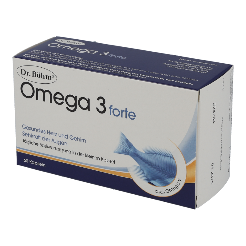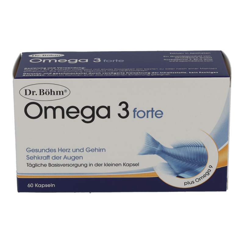 Dr. Böhm Omega 3 forte Kapseln vereinen alle wichtigen, natürlichen Omega-3- und 9-Fettsäuren in nur einer Kapsel – zu Ihrer täglichen Basisversorgung für eine gesunde Herz- und Gehirnfunktion und eine normale Sehkraft der Augen. Die Innovation der magensaftstabilen Kapseln: Sie sind bestens verträglich und sorgen dafür, dass die Inhaltsstoffe völlig geruchs- und geschmacksfrei erst im Darm freigesetzt werden.