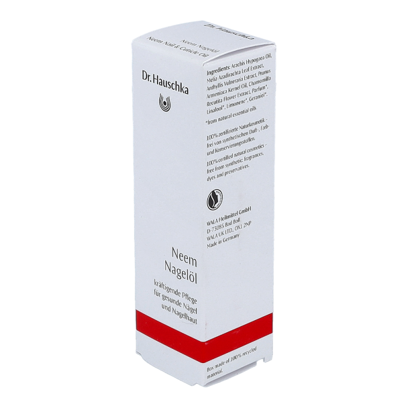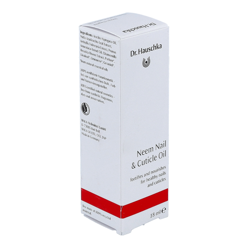 Das Dr. Hauschka Neem Nagelöl festigt und kräftigt die Nägel, hält die Nagelhaut geschmeidig und beugt Rissen vor. Zusätzlich unterstützt das Nagelöl auch nachhaltig die Gesundheit der Nägel, weil dieses Nagelpflegeöl einem übermäßigen Verhornen der Nagelhaut vorbeugt und dabei hilft, dass die Nagelsubstanz gesund nachwächst. Das Neem Nagelöl eignet sich für Hände und Füße.