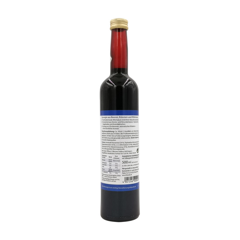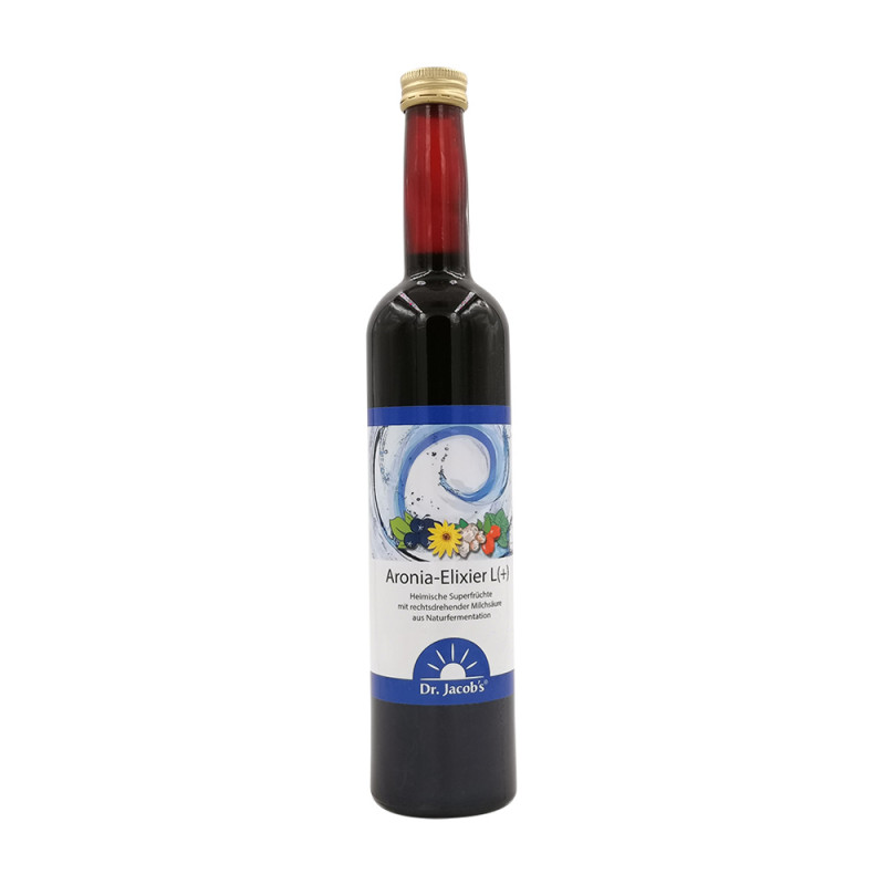 Dr. Jacob’s Aronia-Elixier mit Milchsäure ist ein fruchtig-aromatisches Beerenkonzentrat aus Aronia-, Holunderbeeren, Habegbutte und Acerola. Es enthält 13 % rechtsdrehende Milchsäure aus Naturfermentation und 30 erlesene Kräuter. Die Herstellung erfolgt ohne Zusatz von künstlichen Aromen und zusätzlichem Zucker