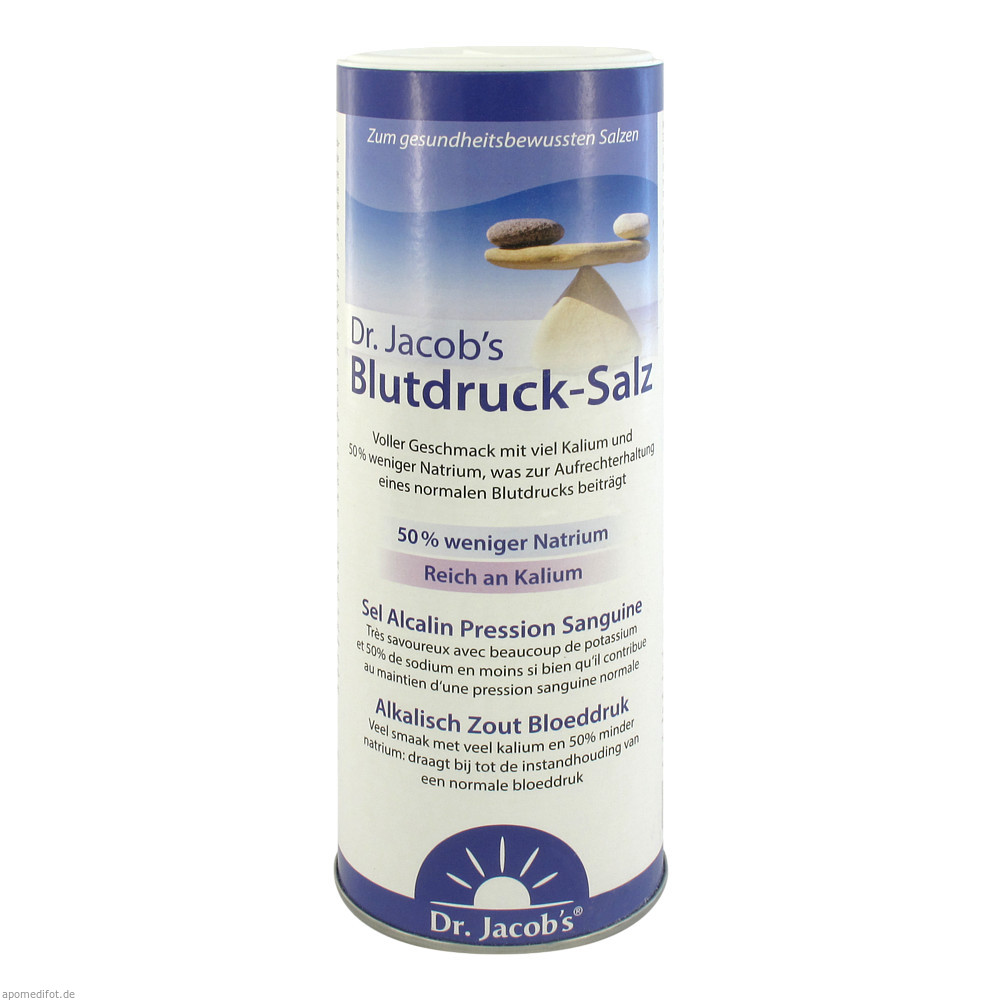 Dr. Jacob“s Blutdruck-Salz ist ein Mineralsalz, das natriumreduziert ist. Es enthält Natriumcitrat als Hauptbestandteil, Kaliumchlorid sowie Kristallsalz vom Rande des Himalaya-Gebietes. Es eignet sich für eine kochsalzreduzierte Ernährung.