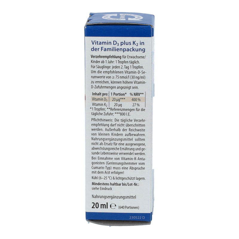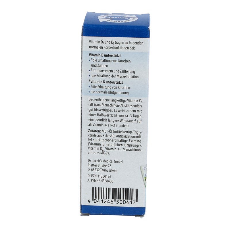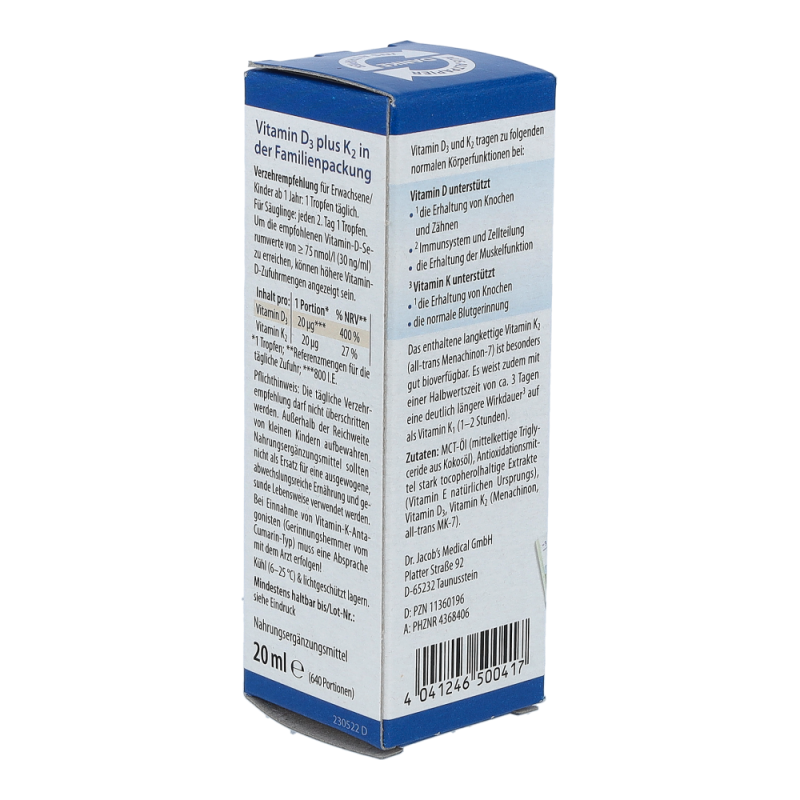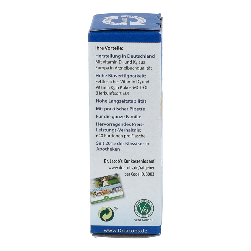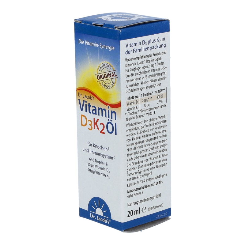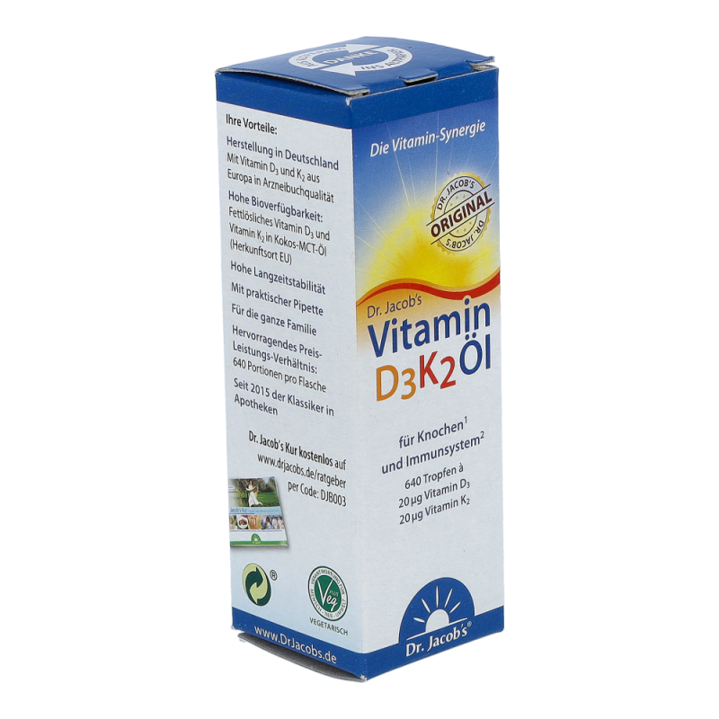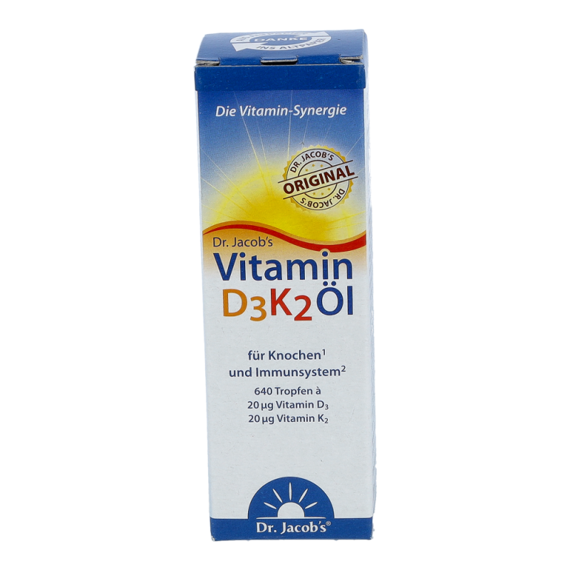 Dr. Jacob’s Vitamin D3K2 Öl unterstützt durch die Kombination von Vitamin D und Vitamin K wichtige Funktionen des Körpers. Vitamin D und Vitamin K werden für die Erhaltung von Knochen und Zähnen, die Muskelfunktion und das Immunsystem benötigt.