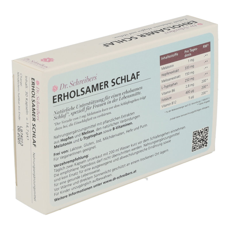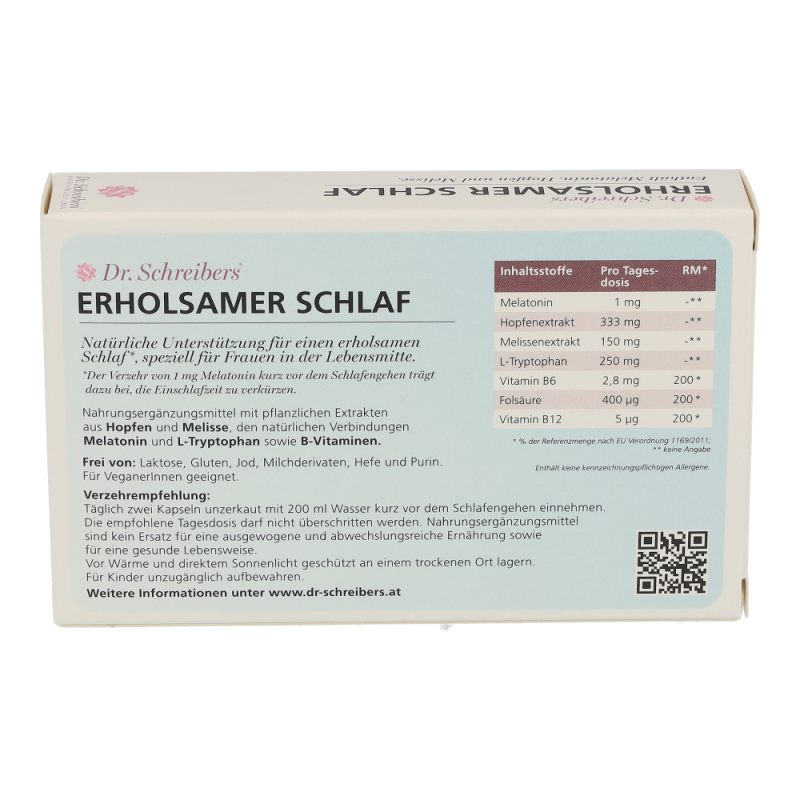 Dr. Schreibers Erholsamer Schlaf bietet natürliche Unterstützung für einen erholsamen Schlaf, speziell für Frauen in der Lebensmitte. Die Kapseln helfen durch ihre hochwertige Kombination an natürlichen und pflanzlichen Inhaltsstoffen entspannt einzuschlafen, gut durchzuschlafen und erholt aufzuwachen.