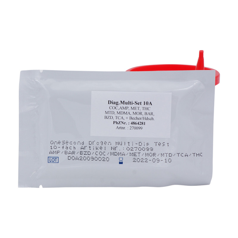 Drogen Multi-Dip Test Streifen 10A (AMP 1000 / BAR 300 / BZD 300 / COC 300 / THC 50 / MET 1000 / MTD 300 / MOR 300 / TCA 1000 / MDMA 500) ist ein schneller und qualitativer Immunoassay zur simultanen Ermittlung von bis zu 12 Drogen, Drogenmetaboliten und Medikamenten im humanen Urin. Der Test ist in der Lage die Stoffe Amphetamin, Barbiturat, Benzodiazepin, Kokain, Cannabinoid, Methamphetamin, Methadon, Morphin, Tricyclische Antidepressiva, sowie Ecstasy nachweisen.