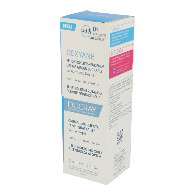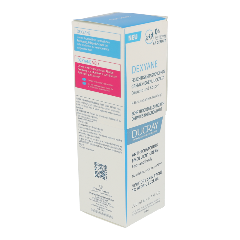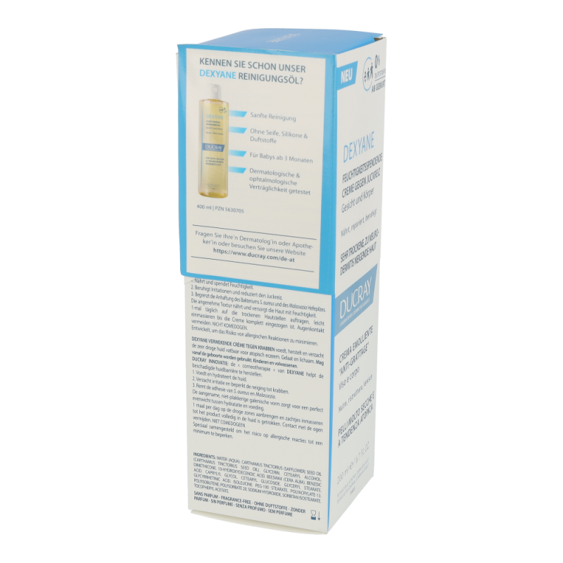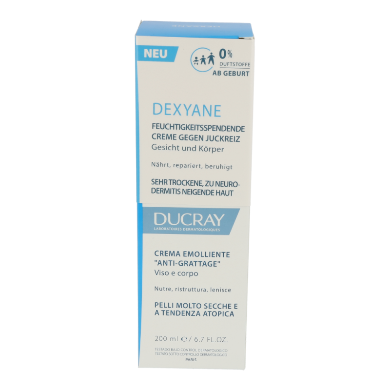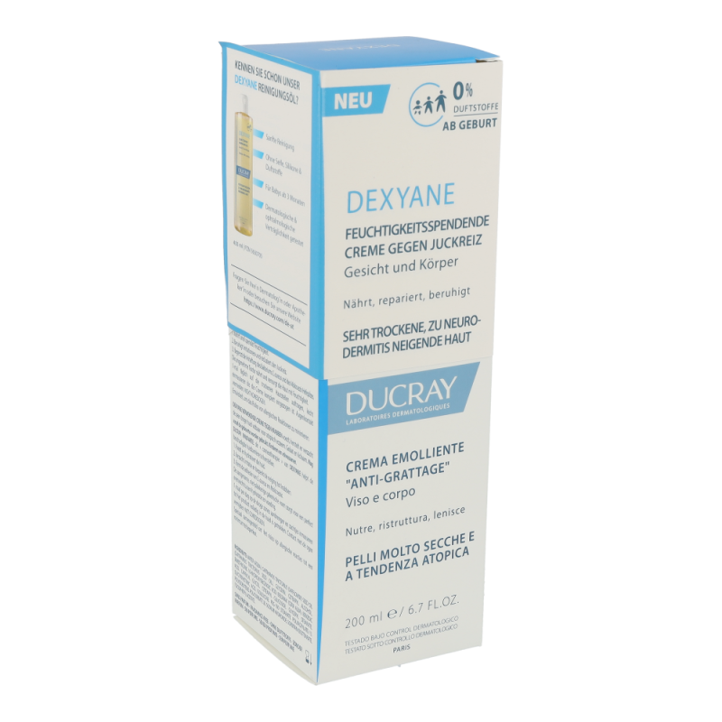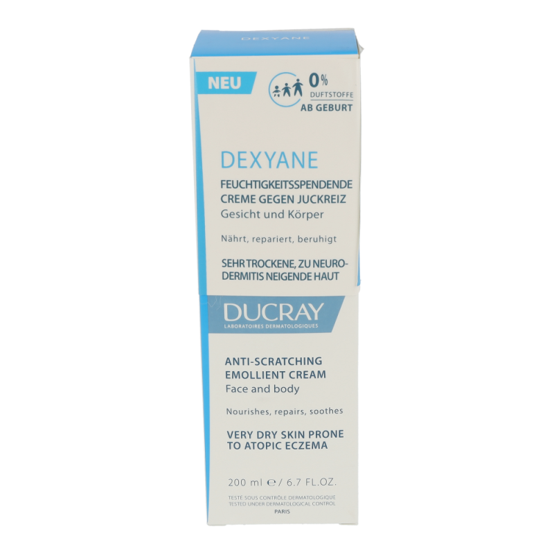 DEXYANE Creme gegen Juckreiz ist eine tägliche Feuchtigkeitspflege für sehr trockene, zu Neurodermitis neigende Haut. Dank der von den Ducray Dermatological Laboratories entwickelten Innovation der Korneotherapie hilft es, die gestörte Hautbarriere zu reparieren. Sie nährt, repariert und lindert den Juckreiz, der durch trockene Haut entsteht. Die Haut ist mit Feuchtigkeit versorgt und angenehm. Die nicht klebrige und nicht fettende Textur ermöglicht ein sofortiges Einziehen.