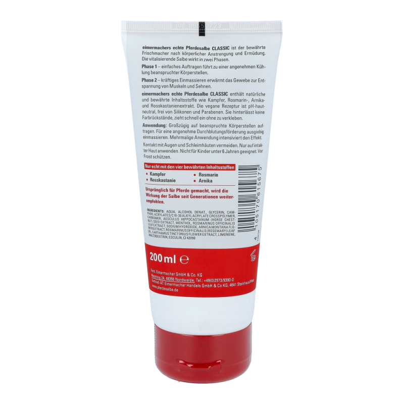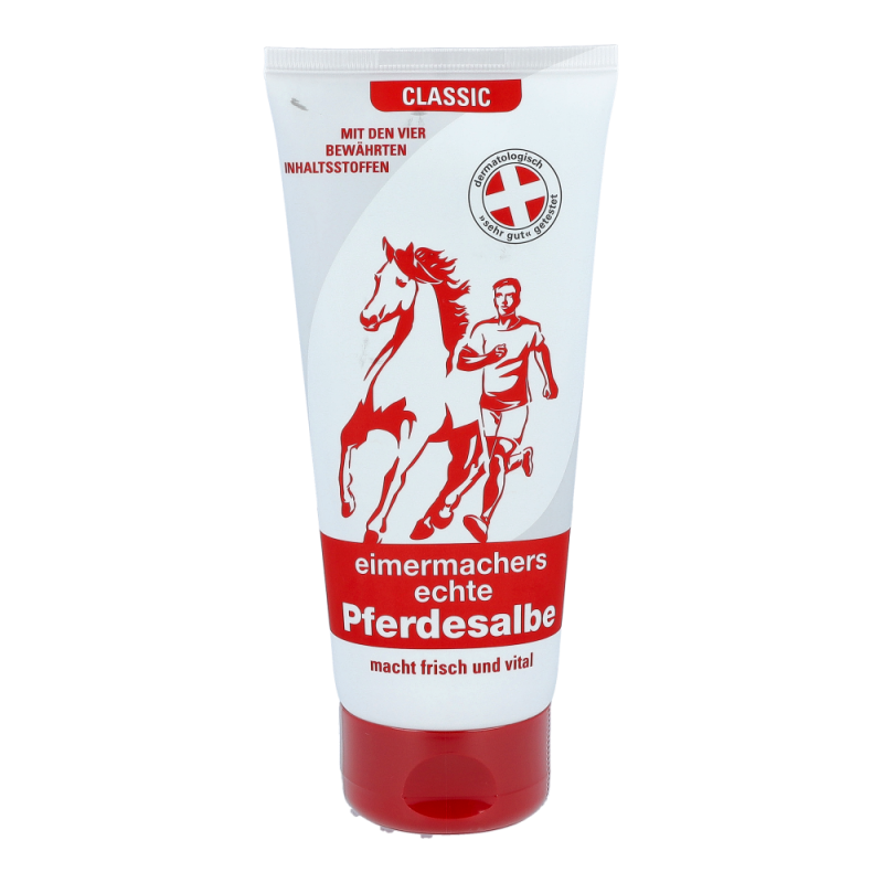 Eimermachers Pferdesalbe Tube ist eine belebende Pflege nach körperlicher Anstrengung und Ermüdung. Das fettfreie Gel spendet der Haut Feuchtigkeit, zieht schnell ein, ohne zu verkleben. Es ist besonders wohltuend und hinterlässt ein gepflegtes Hautbild.