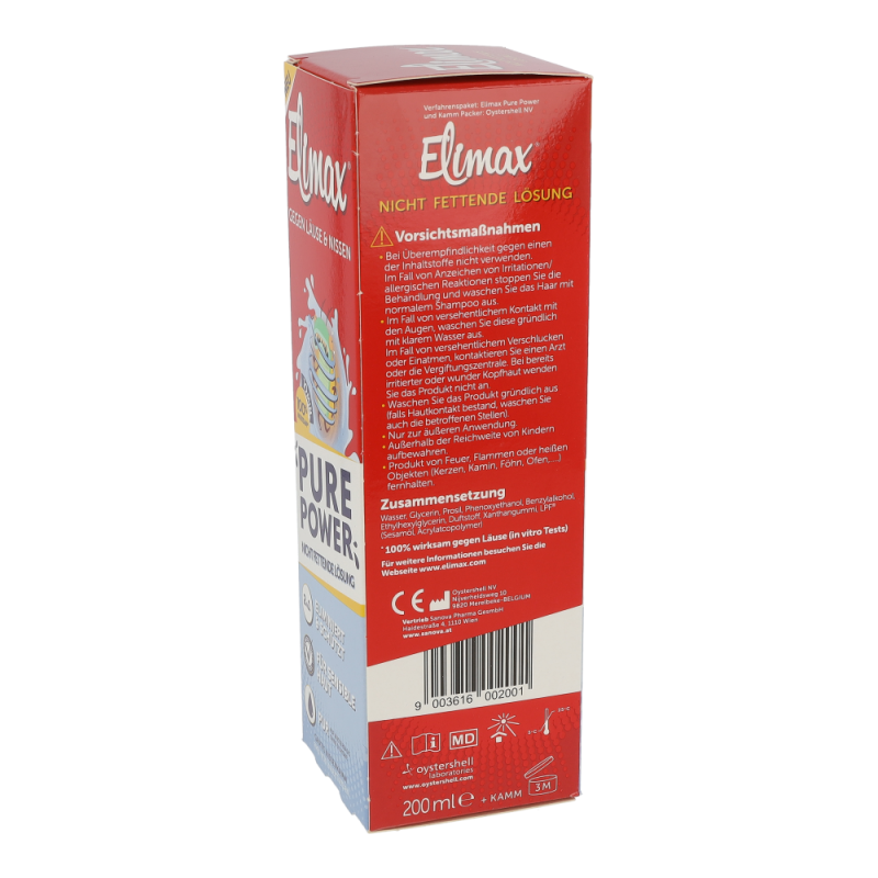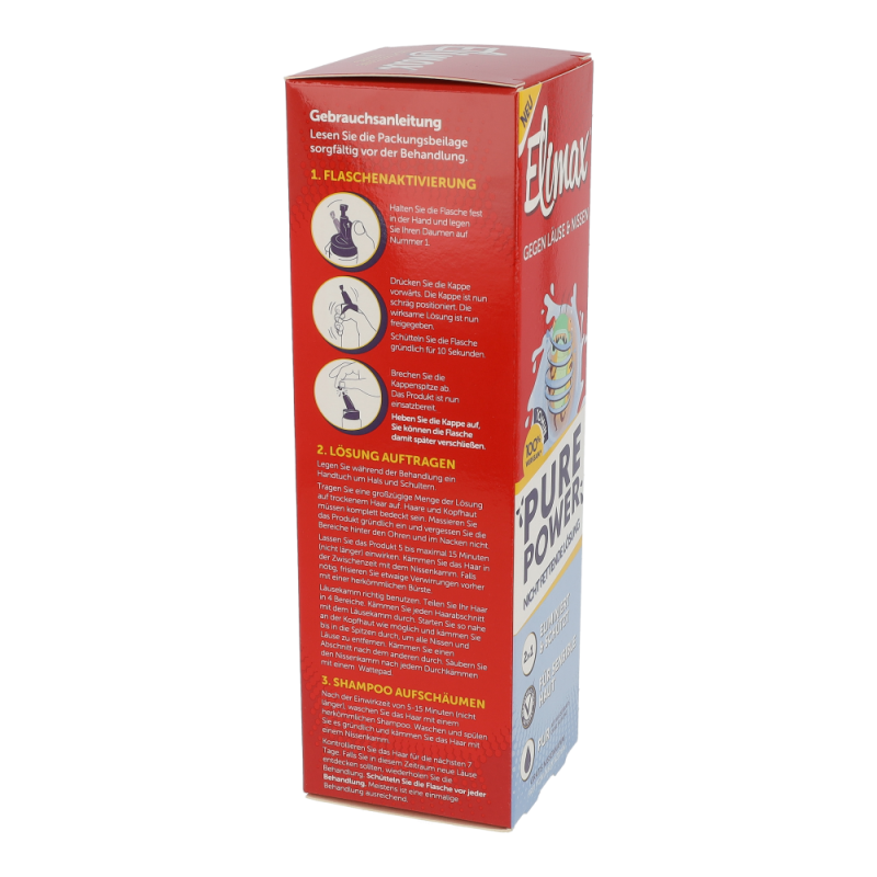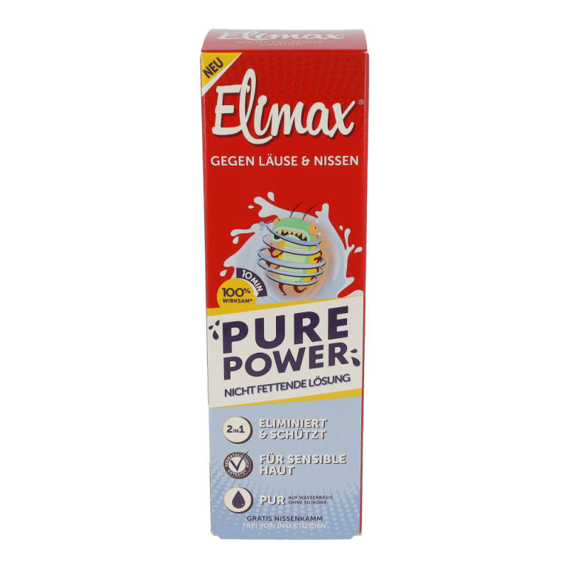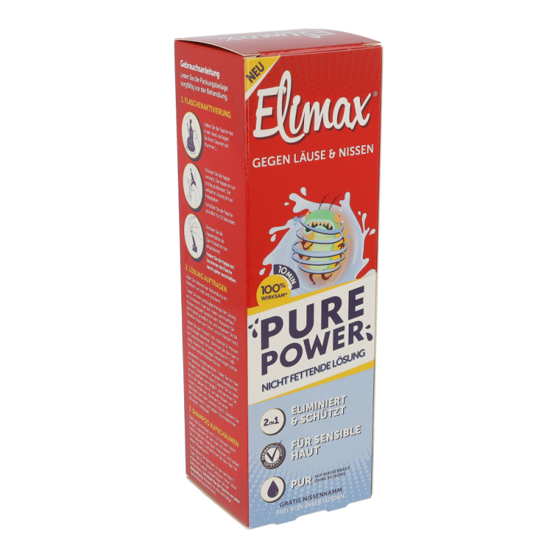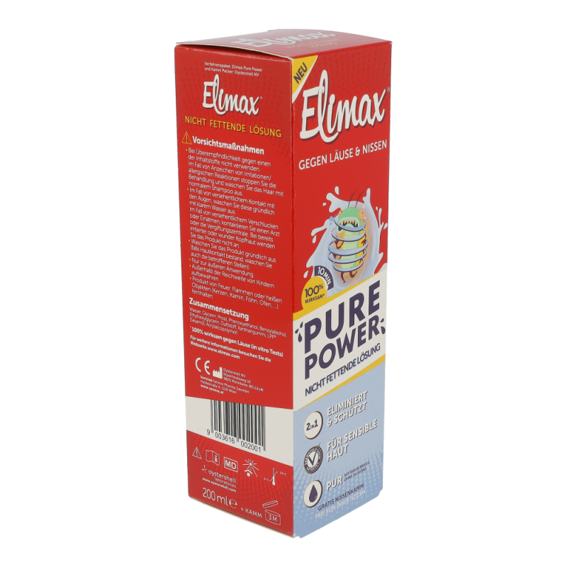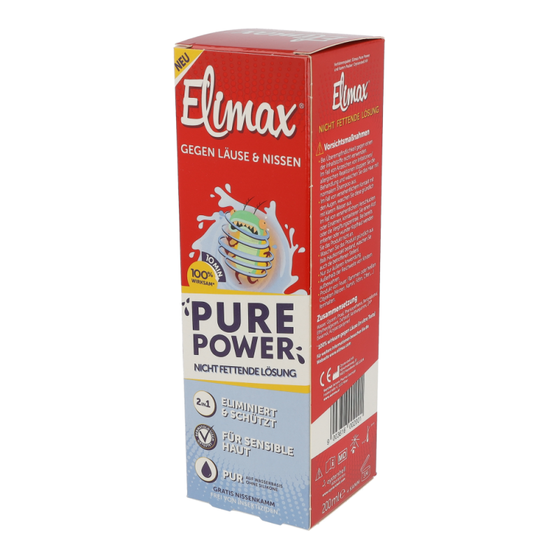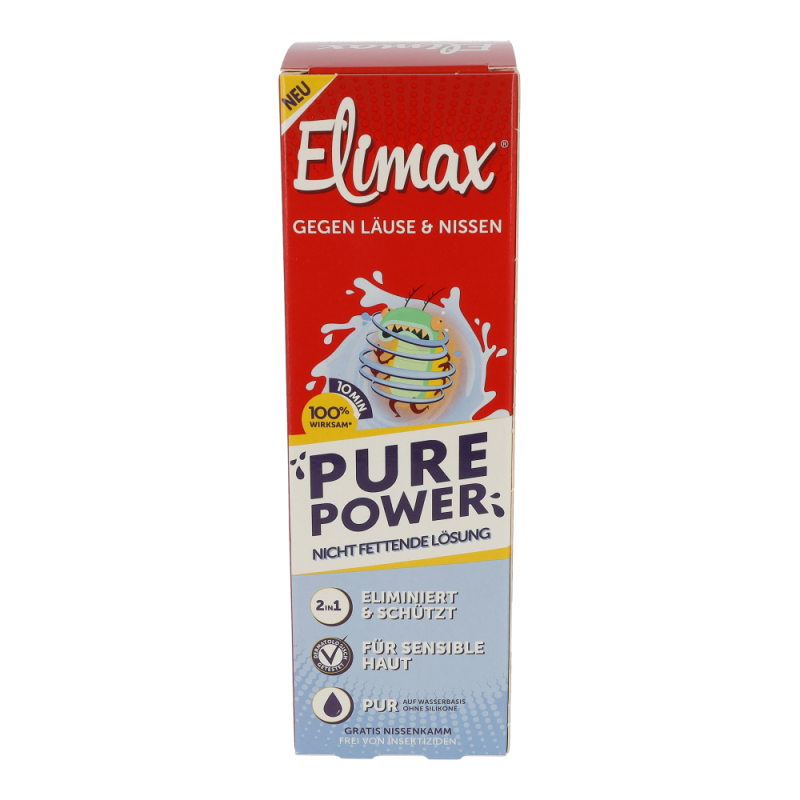 Durch den Wirkstoff Prosil erstickt und dehydriert Elimax® Pure Power Läuse und Nissen. Im Vergleich zu Silikonen legt sich Prosil nicht am Haar an und fettend nicht. Elimax® Pure Power ist frei von Silikonen, Parabenen, Ölen, Salzen und Seifen. Es schützt bis zu 3 Tagen vor neuerlichem Befall. Durch den Wirkstoff Prosil besteht kein Risiko von Haut- und Augenreizungen.