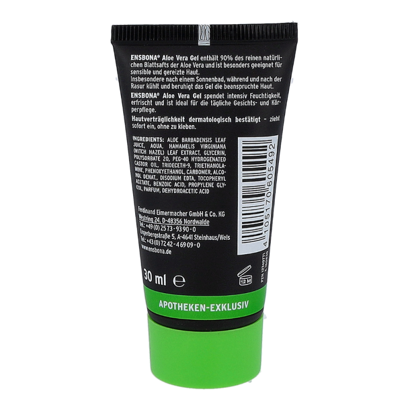Ensbona Aloe Vera Gel 30 ml Tube ist die ideale Pflege für sensible und gereizte Haut. Das Gel spendet Feuchtigkeit, besonders nach der Rasur oder einem Sonnenbad – jetzt das Aloe Vera Gel bestellen, das kühlt, belebt und vitalisiert!