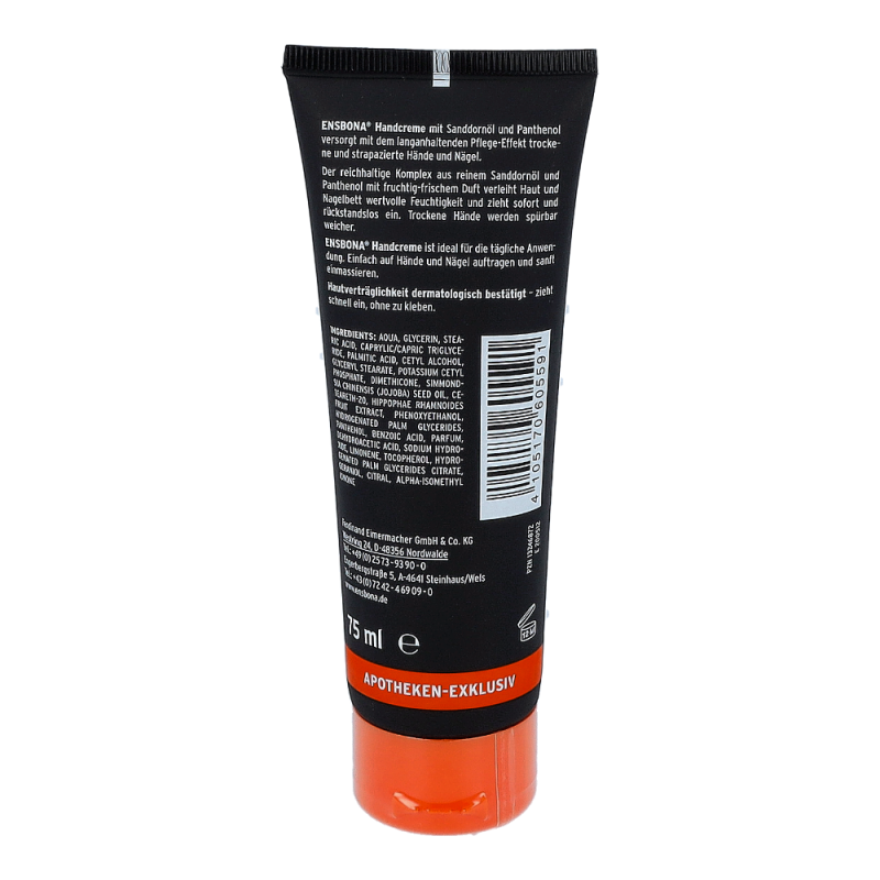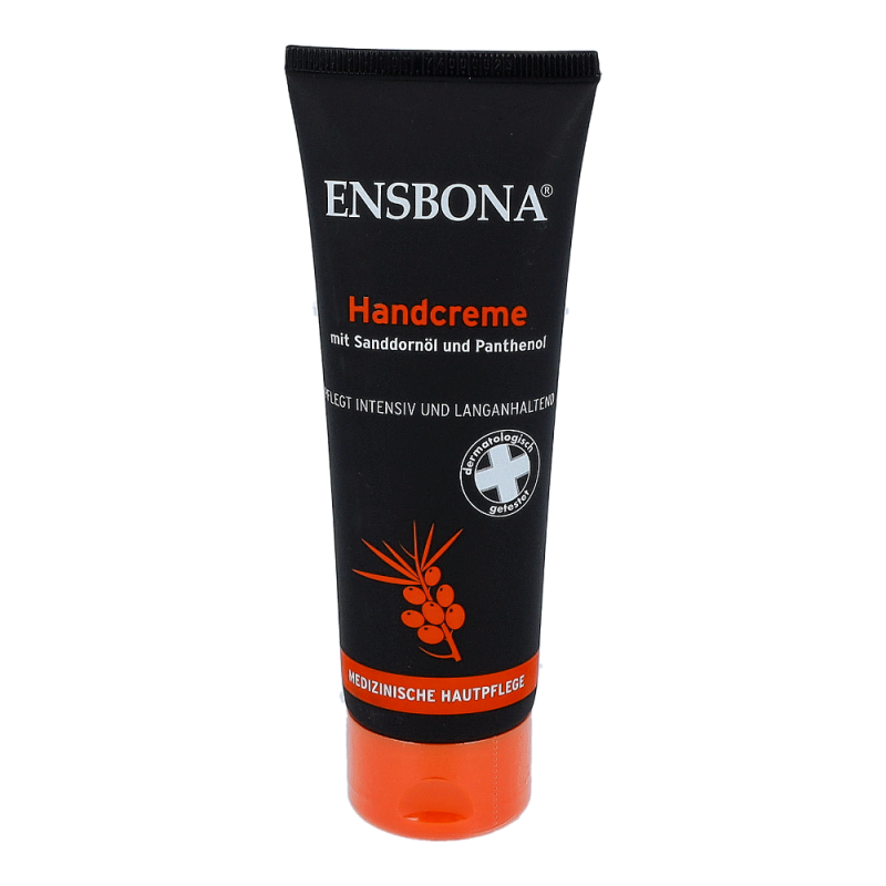Ensbona Handcreme 75 ml Tube mit Sanddornöl und Panthenol versorgt sensible und strapazierte Hände mit hochwertigen Vitaminen und ungesättigten Fettsäuren. Die Creme spendet Feuchtigkeit für die Haut und das Nagelbett – jetzt die Ensbona Handcreme mit fruchtig-frischem Duft bestellen!
