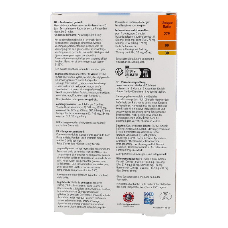 Equazen® Jelly ist ein Nahrungsergänzungsmittel mit Omega-3-Fettsäuren (EPA und DHA) und Omega-6-Fettsäure (GLA). Die Zusammensetzung beruht auf der einzigartigen Formulierung 9 EPA : 3 DHA : 1 GLA. Mit leckerem, fruchtigem Aroma.