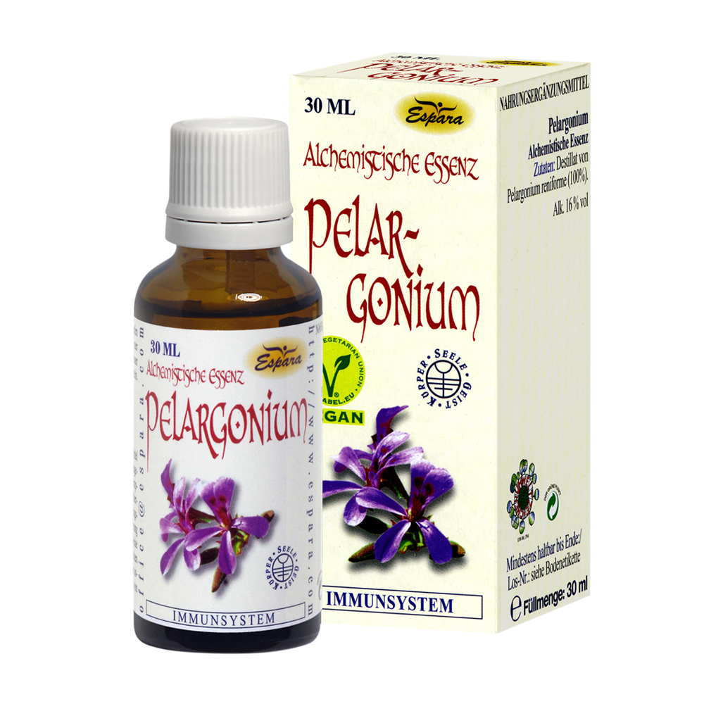 Espara Alchemistische Essenz Pelargonium ist ein Nahrungsergänzungsmittel mit Pelargonium-Destillat. Hergestellt nach einem speziellen, auf Paracelsus zurückgehenden Verfahren