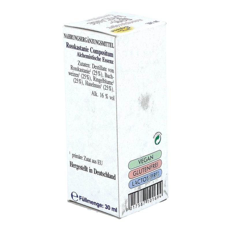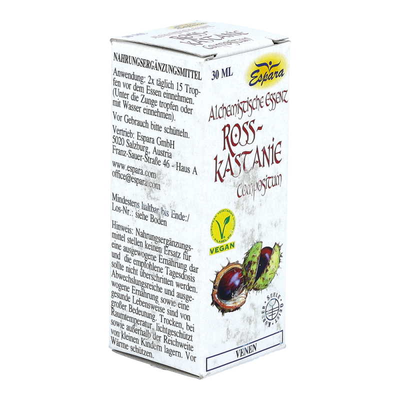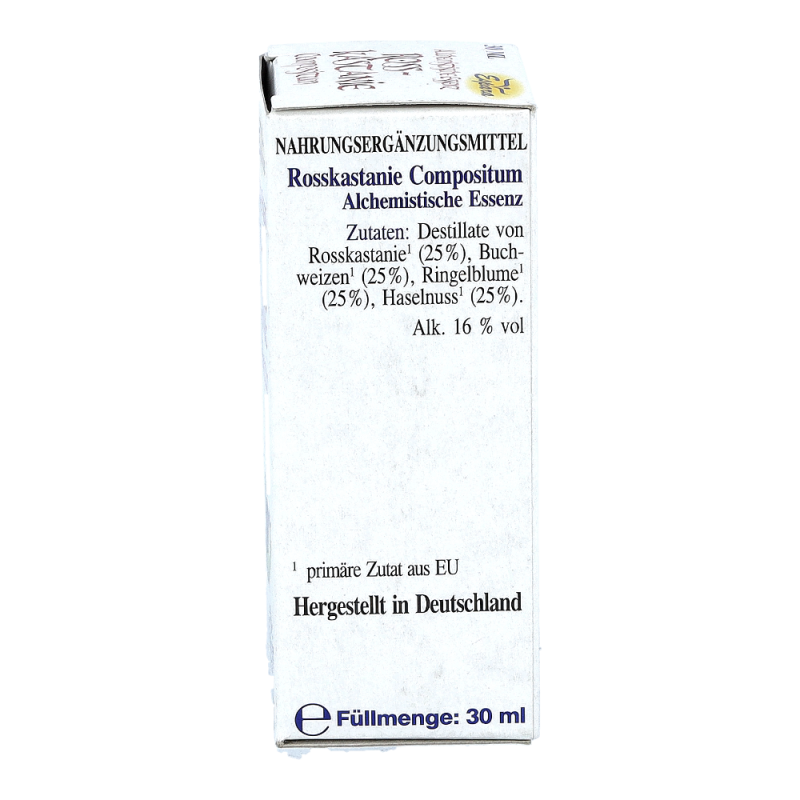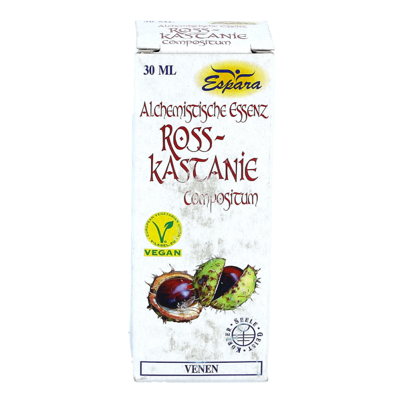 Espara Alchemistische Essenz Rosskastanien Compositum ist ein Nahrungsergänzungsmittel mit Destillaten von Rosskastanie, Buchweizen, Ringelblume und Haselnuss. Rosskastanie ist bekannt für ihre positiven Wirkungen auf die Venen. Hergestellt nach einem speziellen, auf Paracelsus zurückgehenden Verfahren.