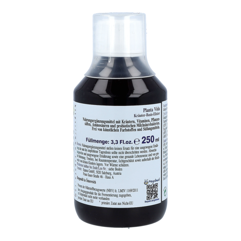 Eigenschaften: Nahrungsergänzungsmittel mit Kräutern, Vitaminen, Pflanzensäften, Aminosäuren, probiotischen Milchsäurebakterien und sekundären Pflanzenstoffen (SPS). Die in diesem Elixier enthaltenen Vitalstoffe liefern dem Organismus eine Basis-Versorgung.