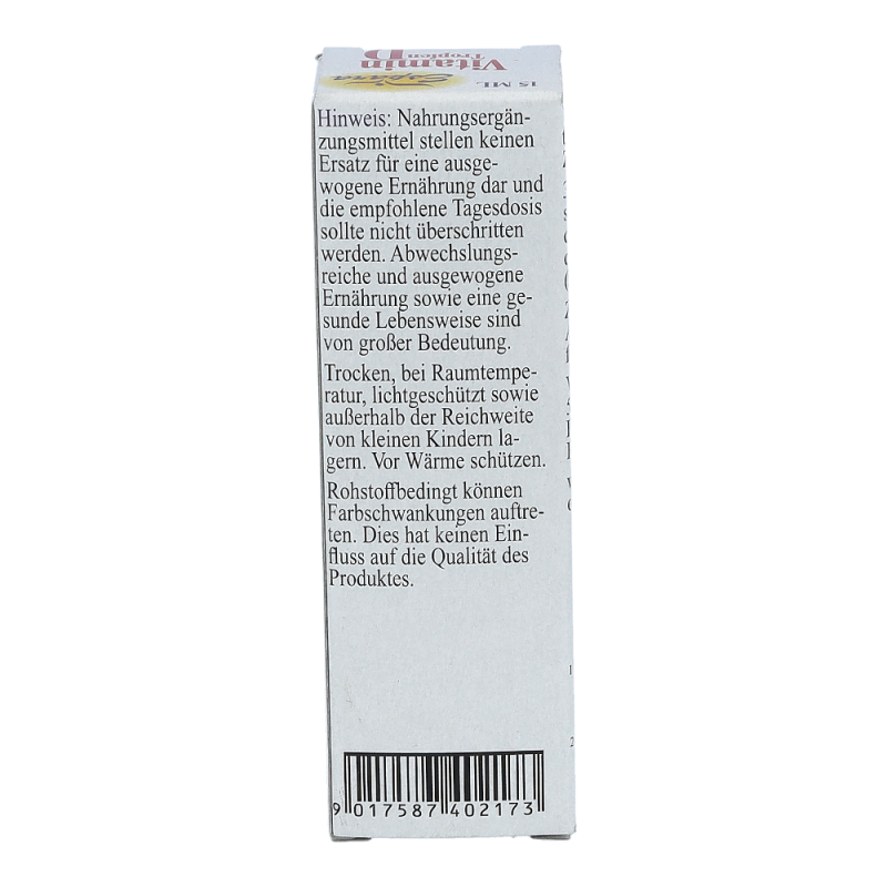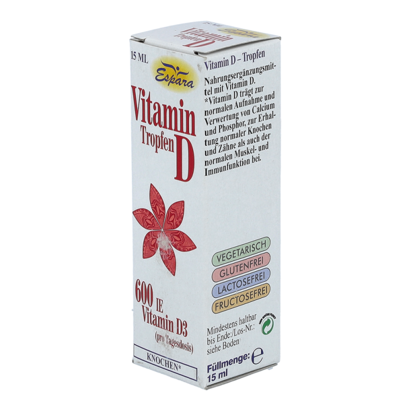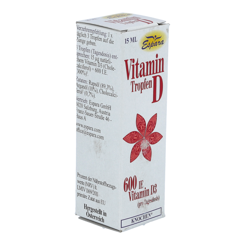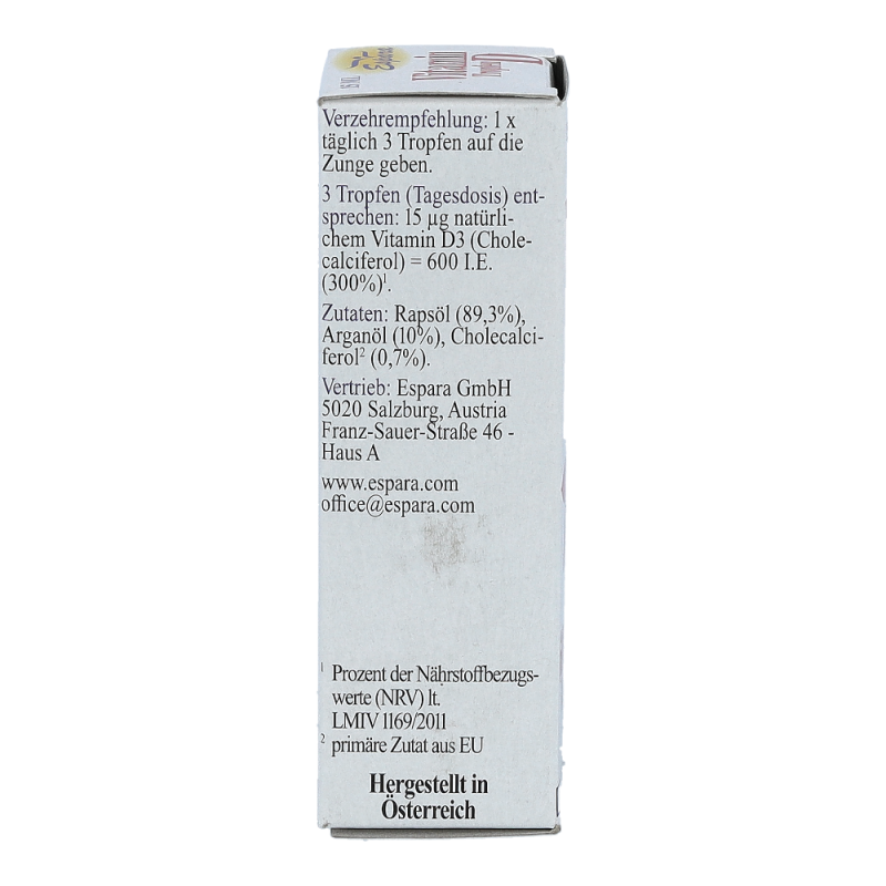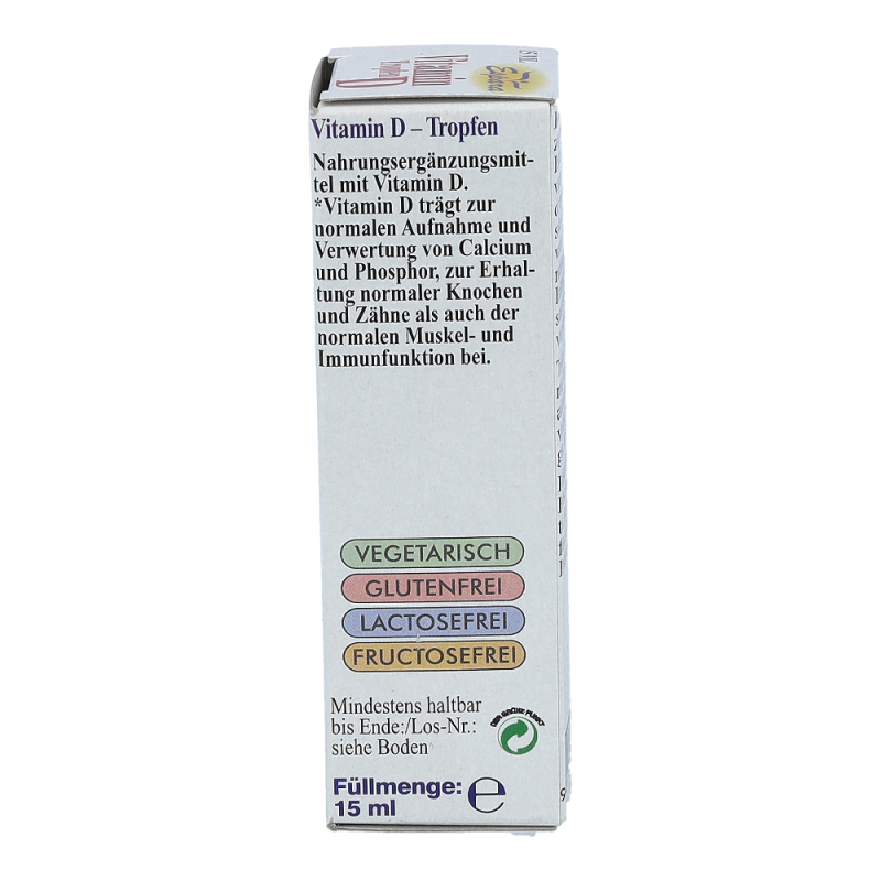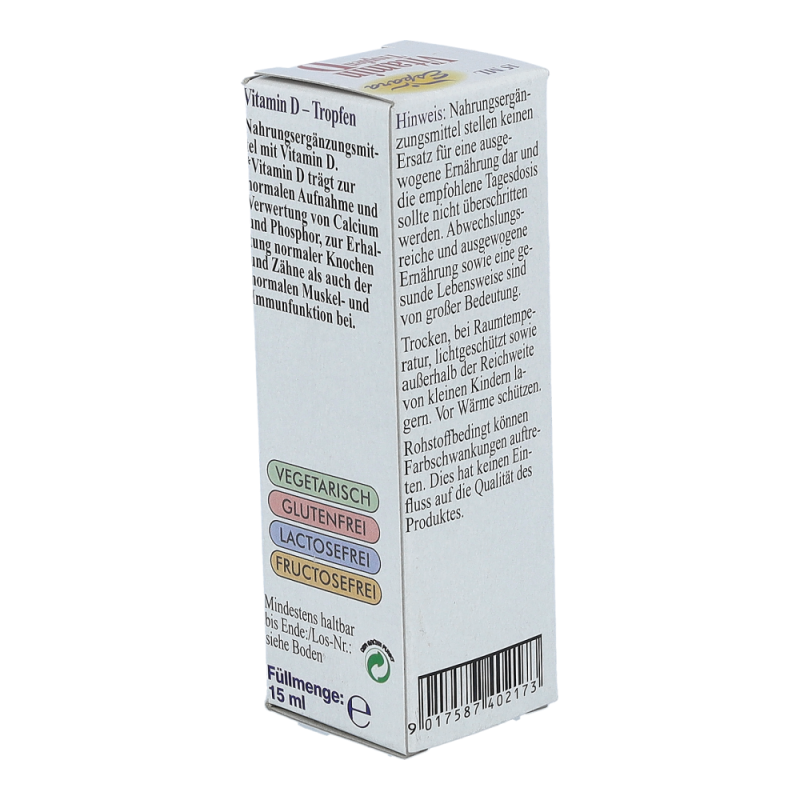 Nahrungsergänzungsmittel mit Vitamin D3. Vitamin D trägt zu einer normalen Aufnahme und Verwertung von Calcium und Phosphor, zur Erhaltung normaler Knochen und Zähne als auch zur Erhaltung der normalen Muskel- und Immunfunktion bei.