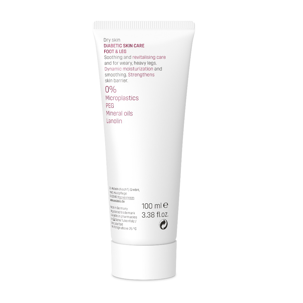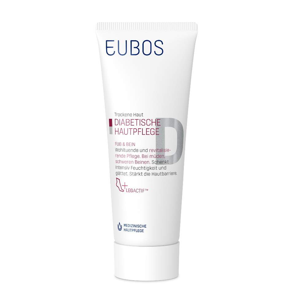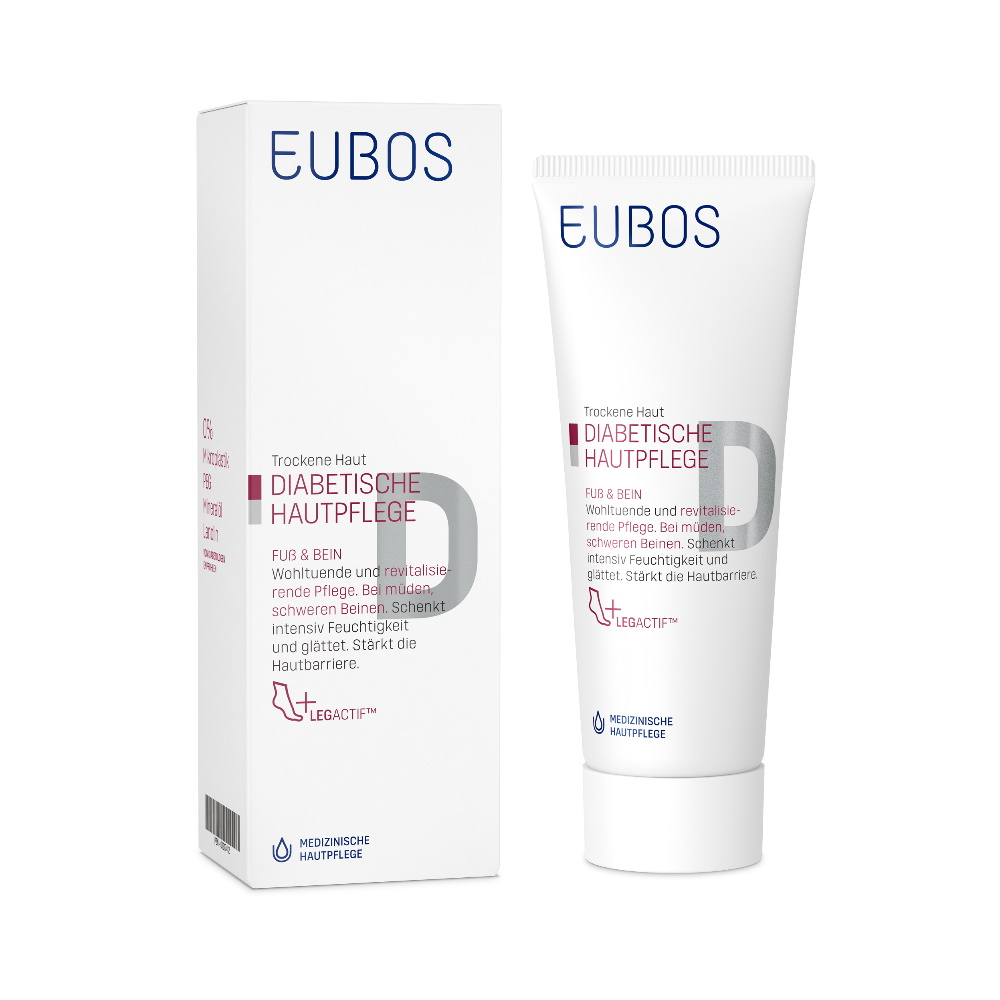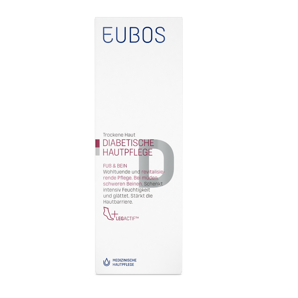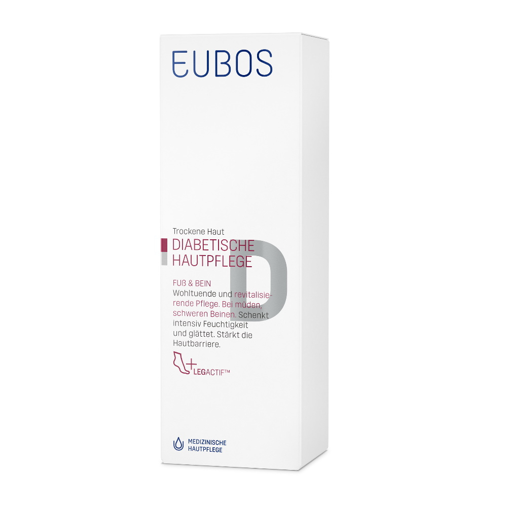 Eubos Diabetische Haut Pflege Fuß > Bein enthält den Wirkstoff-Balsam (O/W-Emulsion) mit speziell auf die diabetische Haut abgestimmten Multiv-Activ Formel und spendet nachhaltig und langanhaltend Feuchtigkeit. Es stärkt die Abwehrkraft der Haut. Für die tägliche Fuß- und Beinpflege bei trockener, sehr trockener, spannender und gereizter Haut.