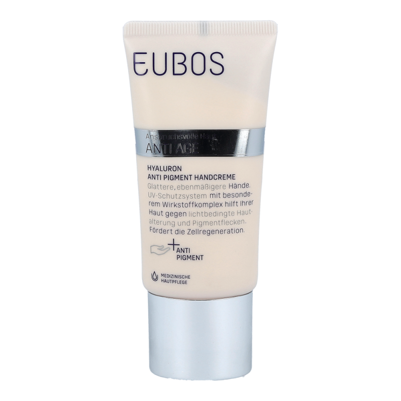 Eubos Hyaluron Anti-Pigment Handcreme LSF 15 bietet eine innovative Spezialformel – für jünger wirkende Hände – wirkt gegen raue Hände und unregelmäßige Hautpigmentierung, mit vorbeugendem Schutz gegen lichtbedingte Hautalterung.