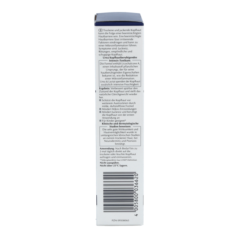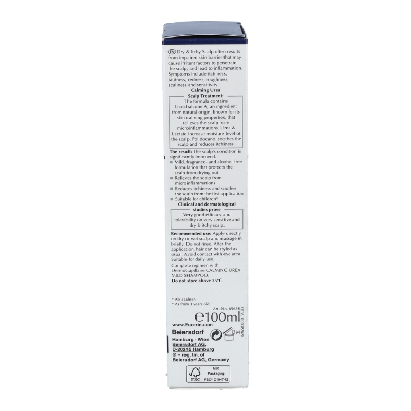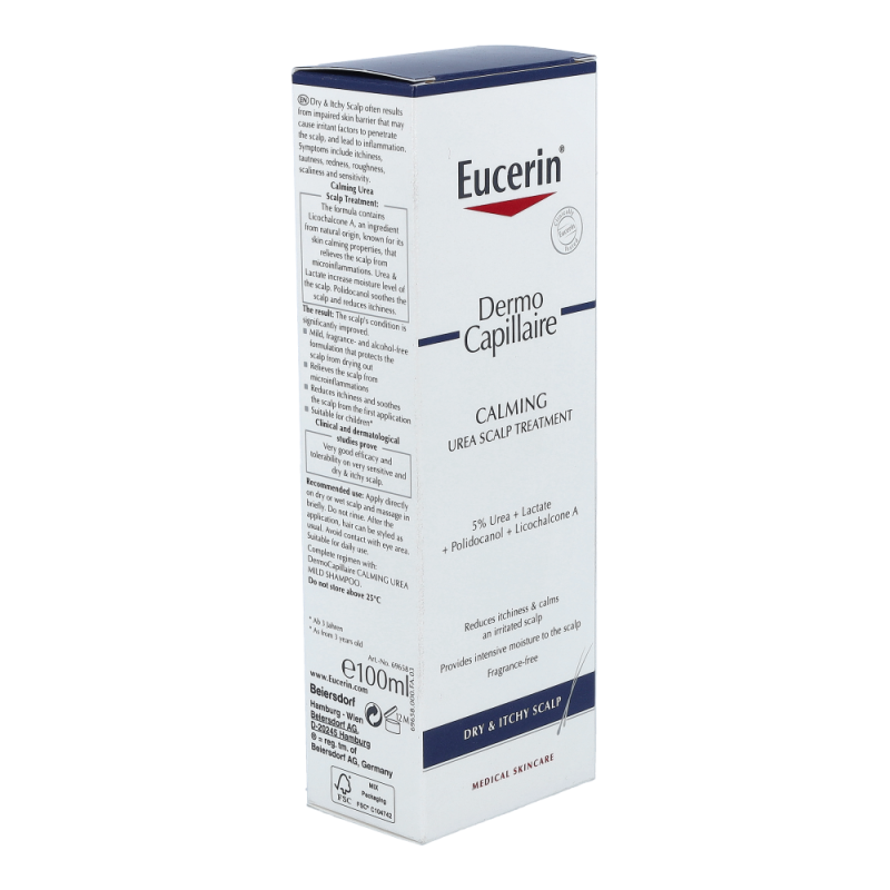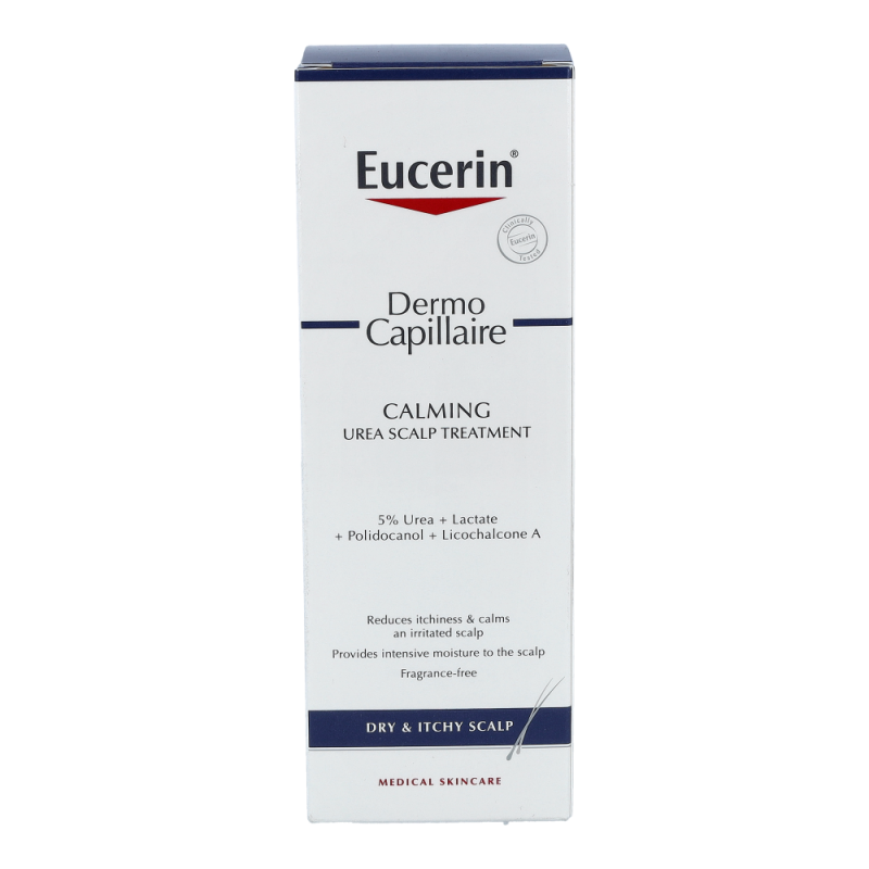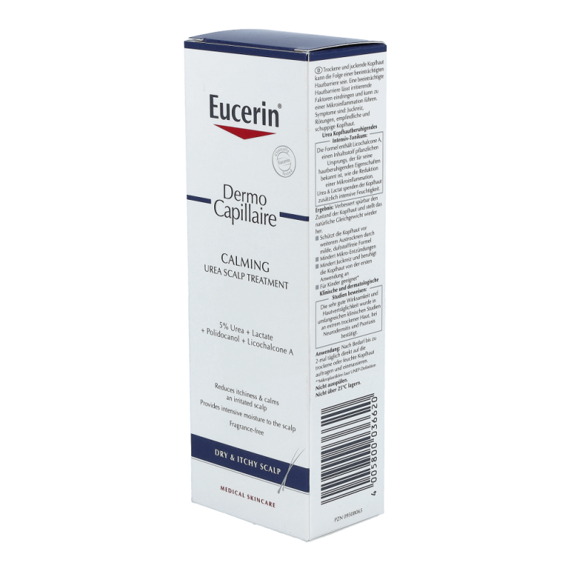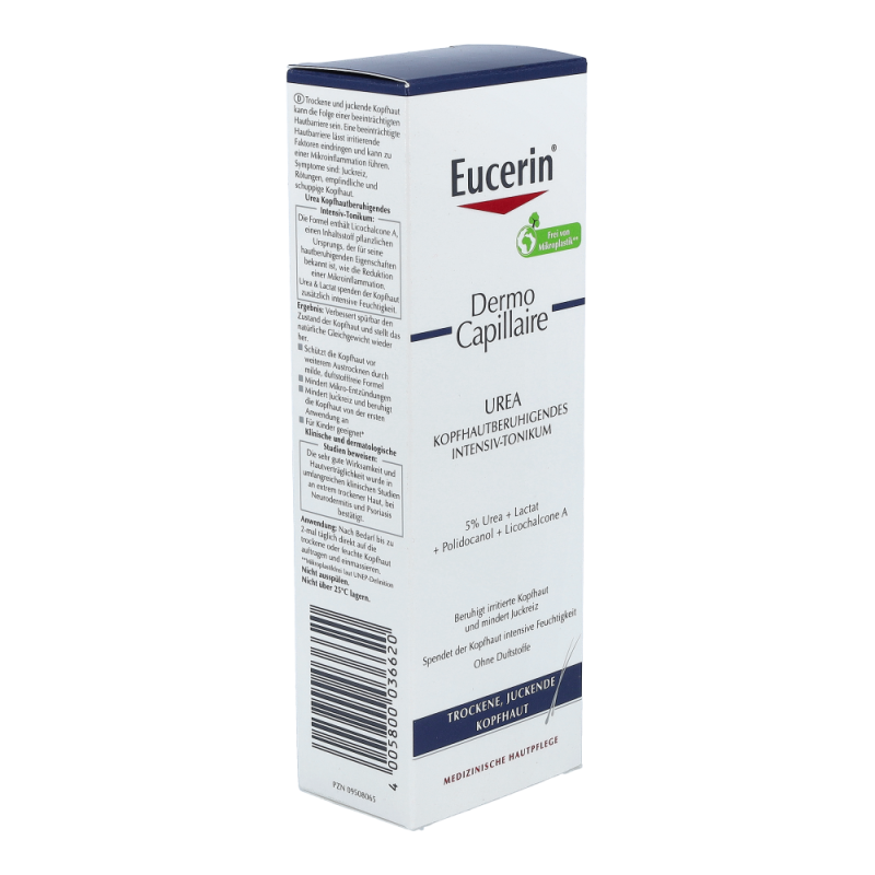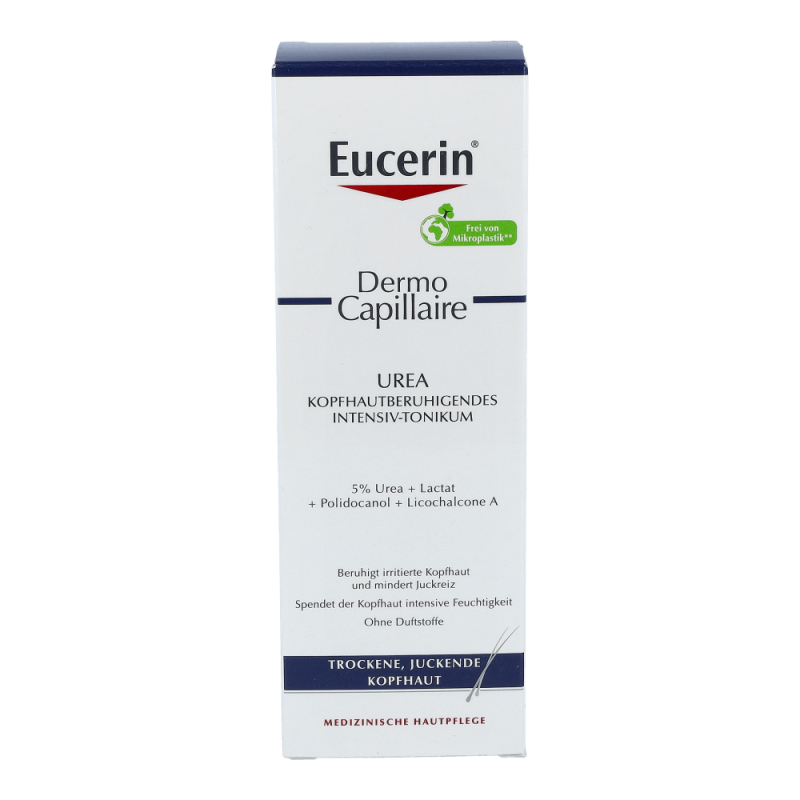 Eucerin DermoCapillaire Kopfhautberuhigendes Urea Intensiv-Tonikum wurde speziell für Menschen mit trockener und juckender Kopfhaut entwickelt. Die Formel ohne Ausspülen klebt nicht und spendet der Kopfhaut lang anhaltende intensive Feuchtigkeit, um Irritationen zu beruhigen und Juckreiz zu mindern – von der ersten Anwendung an. Es mindert Mikro-Entzündungen, die Trockenheit und Juckreiz verursachen, und verbessert dadurch den Zustand der Kopfhaut spürbar. Das natürliche Gleichgewicht der Kopfhaut wird wieder hergestellt.