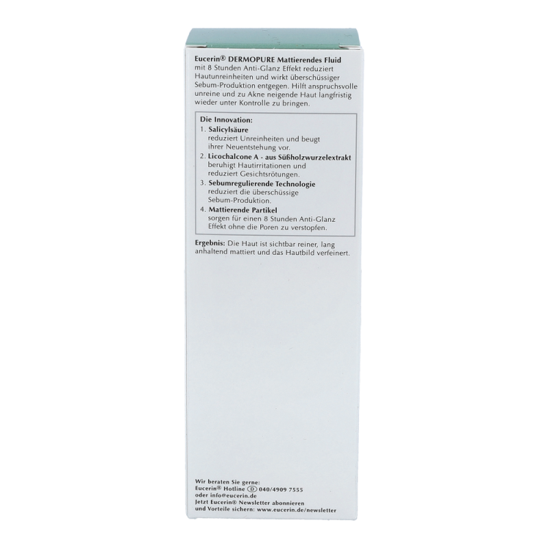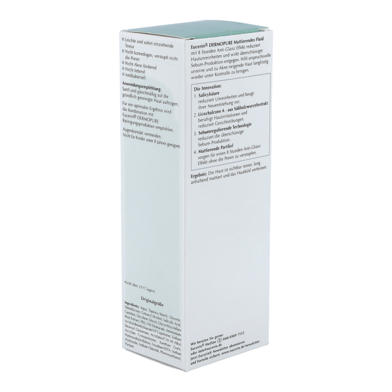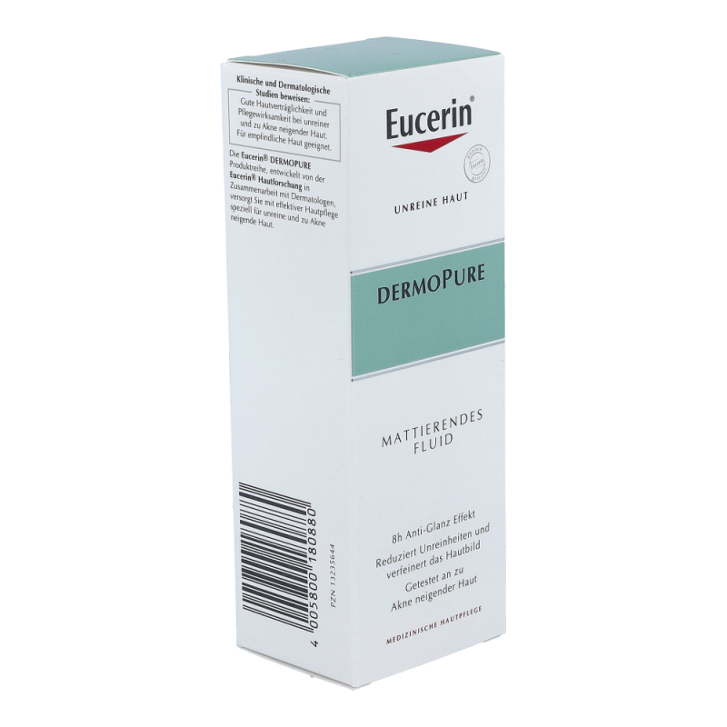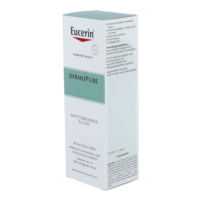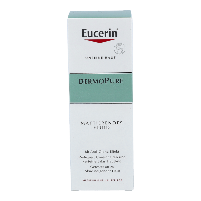 Eucerin Dermopure Mattierendes Fluid 50 ml mit 8h Anti-Glanz Effekt wirkt effektiv gegen Unreinheiten und hilft, anspruchsvolle, unreine, zu Akne neigende Haut langfristig wieder unter Kontrolle zu bringen.