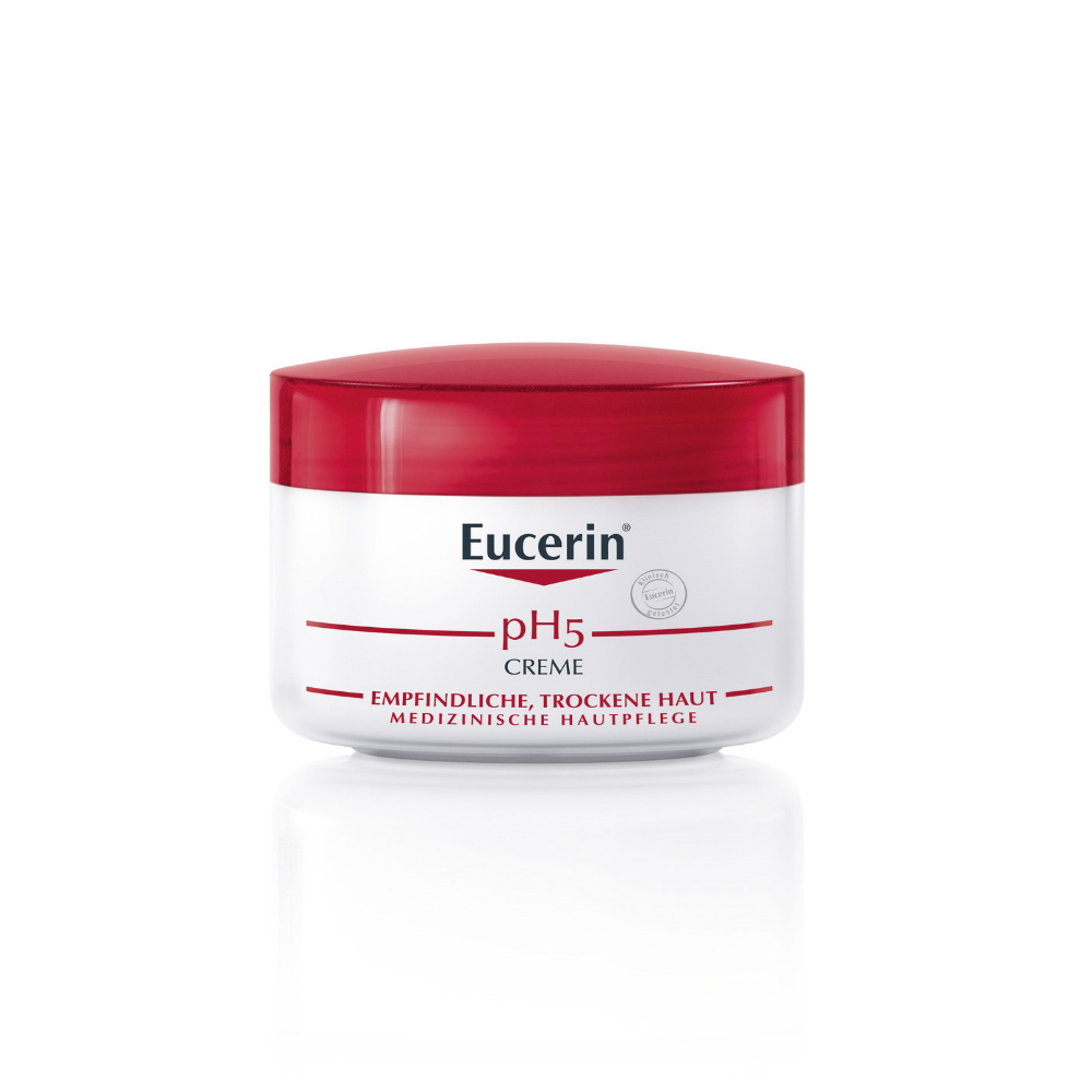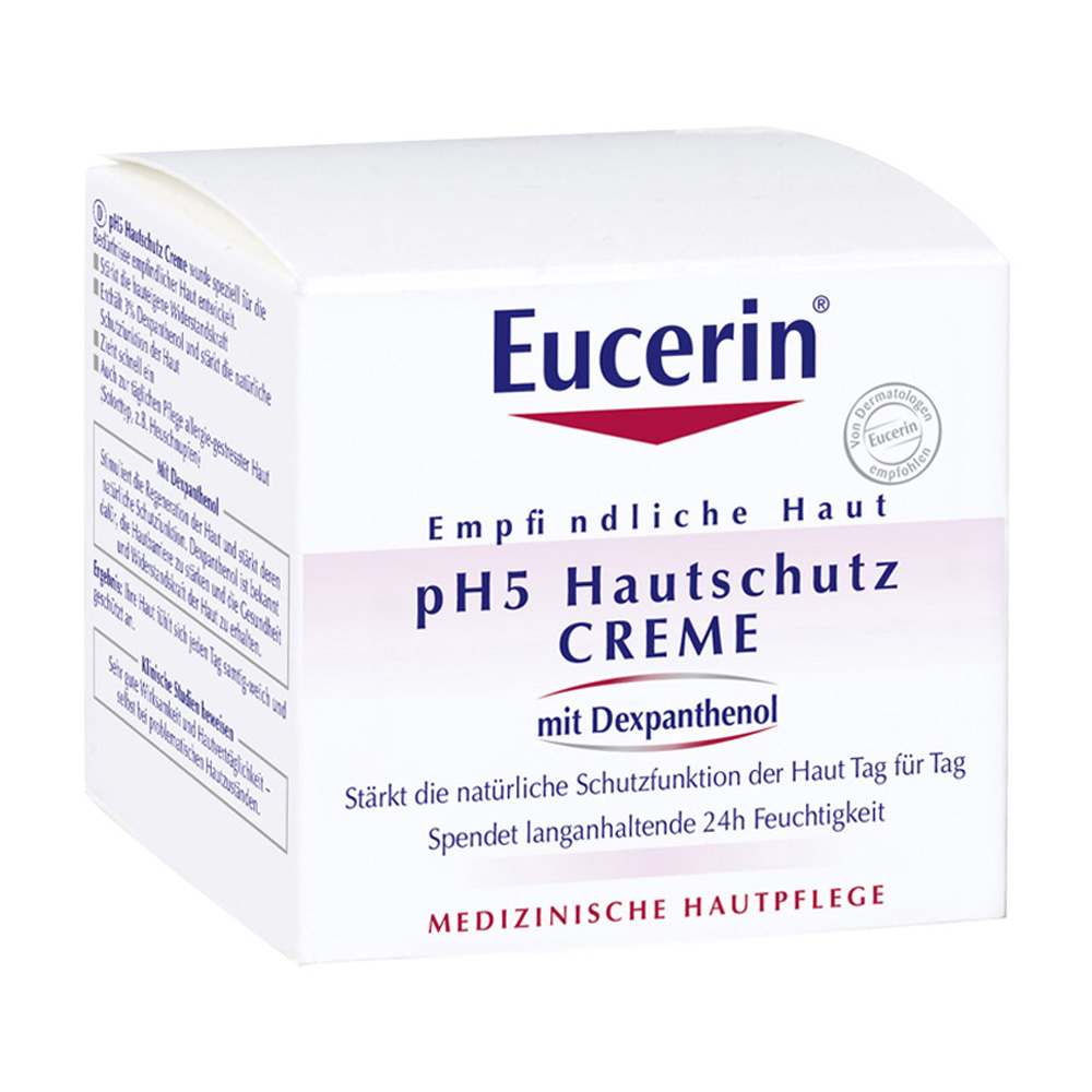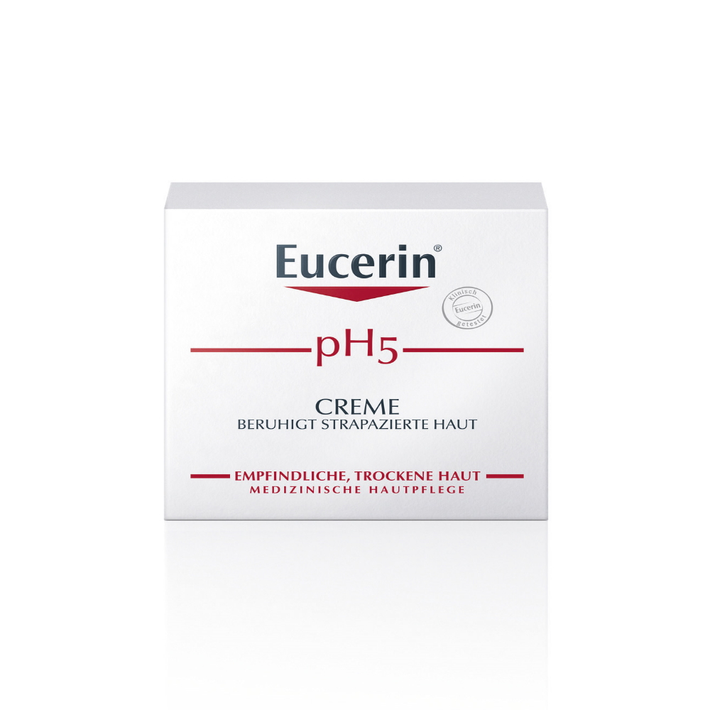 Eucerin pH5 Creme wurde speziell für empfindliche Körper- und Gesichtshaut entwickelt. Sie enthält den pH5-Enzymschutz, der nachweislich die hauteigenen Enzyme aktiviert. Durch die Stärkung der natürlichen Hautabwehr von innen fördert die besondere Rezeptur den Wiederaufbau der pH-Werte, fördert die Regeneration und füllt die hauteigenen Feuchtigkeitsdepots für bis zu 24 Stunden auf. Zudem wurde gezeigt, dass 90% weniger Pollen durch die Haut dringen. Daher ist sie auch für allergiegestresste Haut geeignet. Dank Dexpanthenol fördert die Creme die Wundheilung. Für lang anhaltenden Schutz und zarte, glatte Haut täglich auftragen.