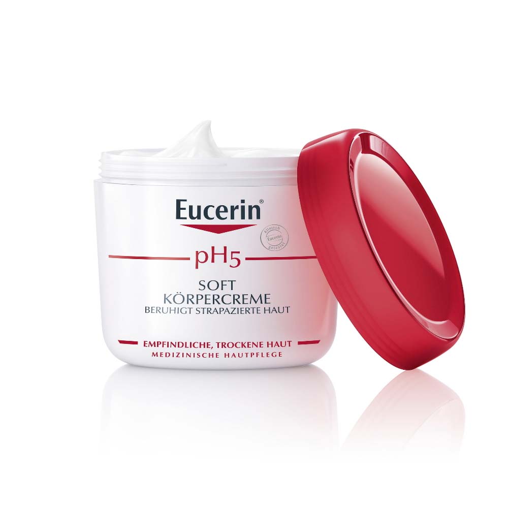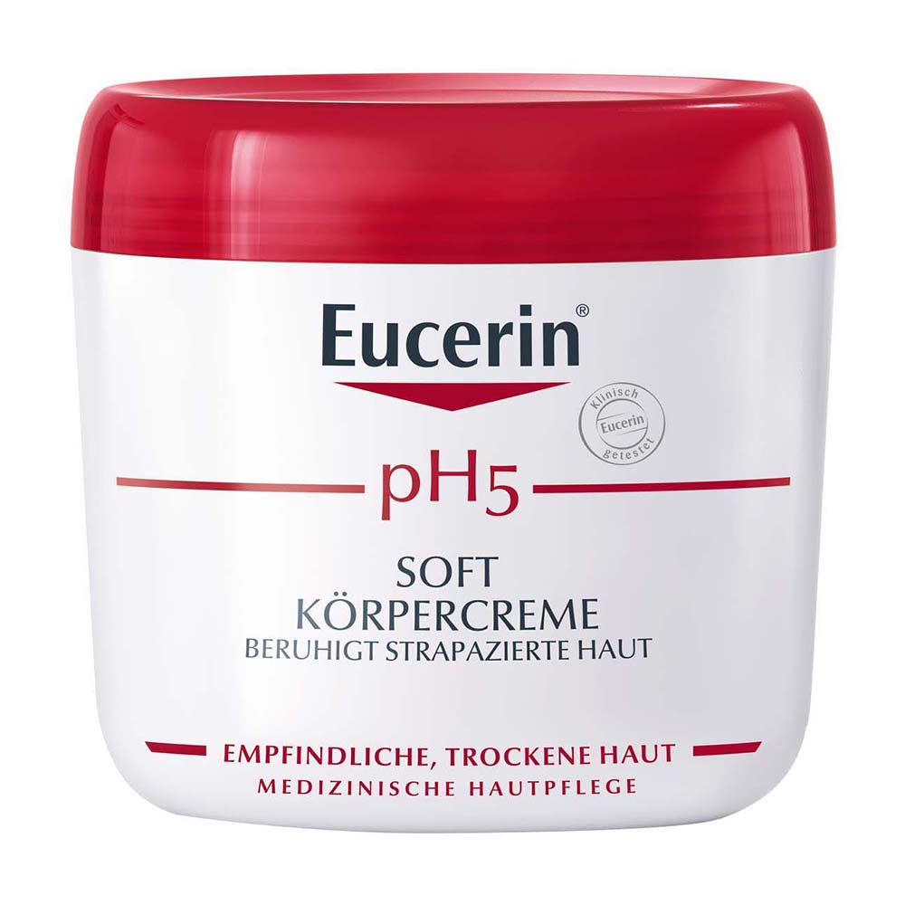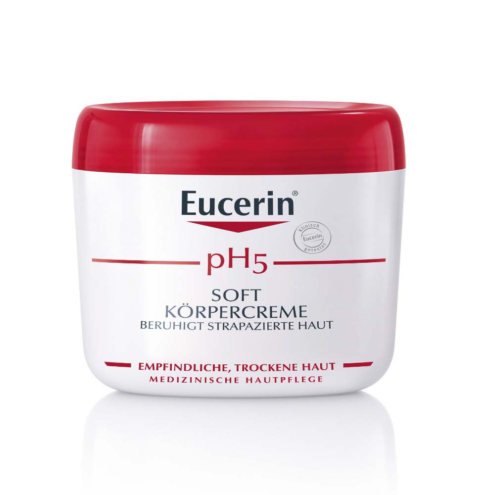 Eucerin pH5 Körpercreme Soft wurde speziell für die Bedürfnisse empfindlicher Körperhaut entwickelt. Die Formel enthält 5 % Dexpanthenol, einen Wirkstoff, der die Hautregeneration anregt und die Schutzbarriere der Haut stärkt. Die Creme macht die Haut elastischer und spendet ihr die täglich intensive Feuchtigkeit, die sie braucht. Sie enthält weder Parabene noch Paraffine. Die leichte Formel zieht schnell ein und sorgt für eine zarte und geschmeidige Haut, ohne ein fettiges Hautgefühl zu hinterlassen. Sie hat einen leichten frischen Duft und ist in einem praktischen 450 ml Tigel für die Anwendung am gesamten Körper geeignet. – alle Produkte von Eucerin mit hohem Rabatt bestellen!