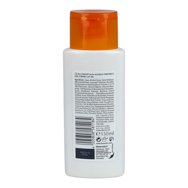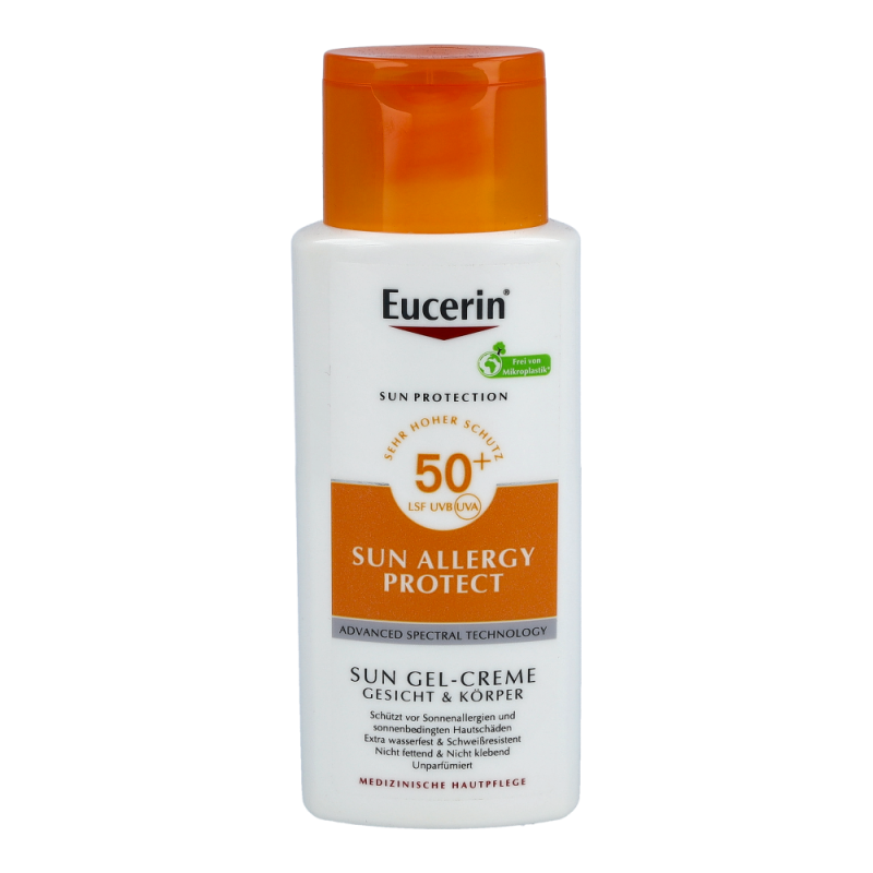 Eucerin Sonnen Allergie Schutz Sun Creme-Gel bietet hohen Schutz für Gesicht und Körper bei sonnenallergiegefährdeter Haut. Die ADVANCED SPECTRAL TECHNOLOGY kombiniert UVA/UVB-Filter1 für hohen UV-Schutz und Licochalcone A zur Neutralisation freier Radikale, ausgelöst durch UV- und hochenergetisches sichtbares Licht. Es enthält ebenso Glucosylrutin zum Schutz vor sonnenbedingten Allergien wie PLD. Dieses Produkt ist mit den Lichtschutzfaktoren 25 und 50 in Packungen zu 150 ml erhältlich.