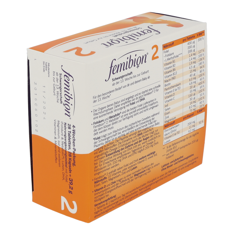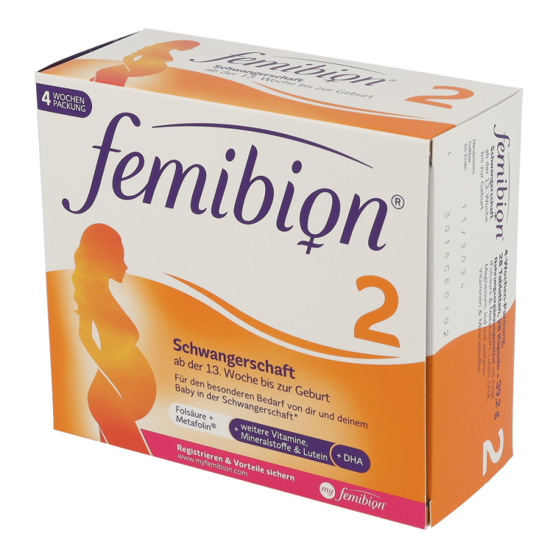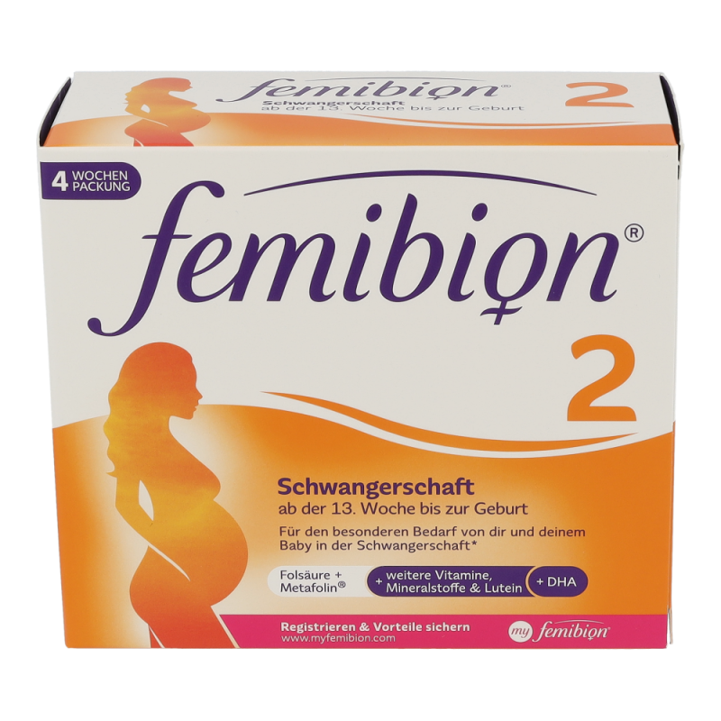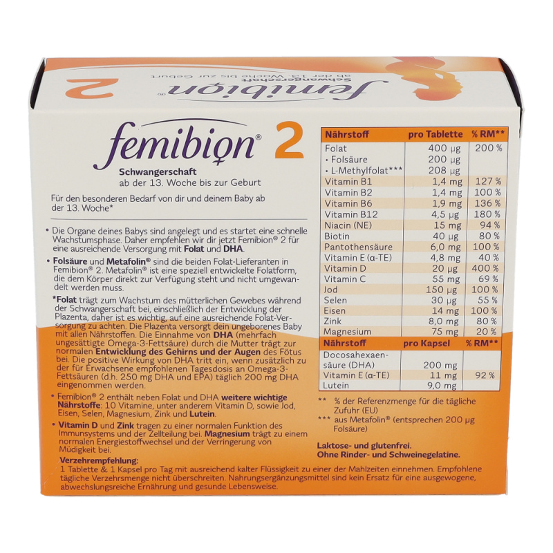 Für den besonderen Bedarf von Mutter und dem Baby in der Schwangerschaft. Die Organe des Babys sind angelegt und es startet eine schnelle Wachstumsphase. Femibion® 2 wird daher für eine ausreichende Versorgung mit Folat und DHA eingenommen. Folsäure und Metafolin® sind die beiden Folat-Lieferanten in Femibion®. Metafolin® ist eine speziell entwickelte Folatform, die dem Körper direkt zur Verfügung steht und nicht umgewandelt werden muss.