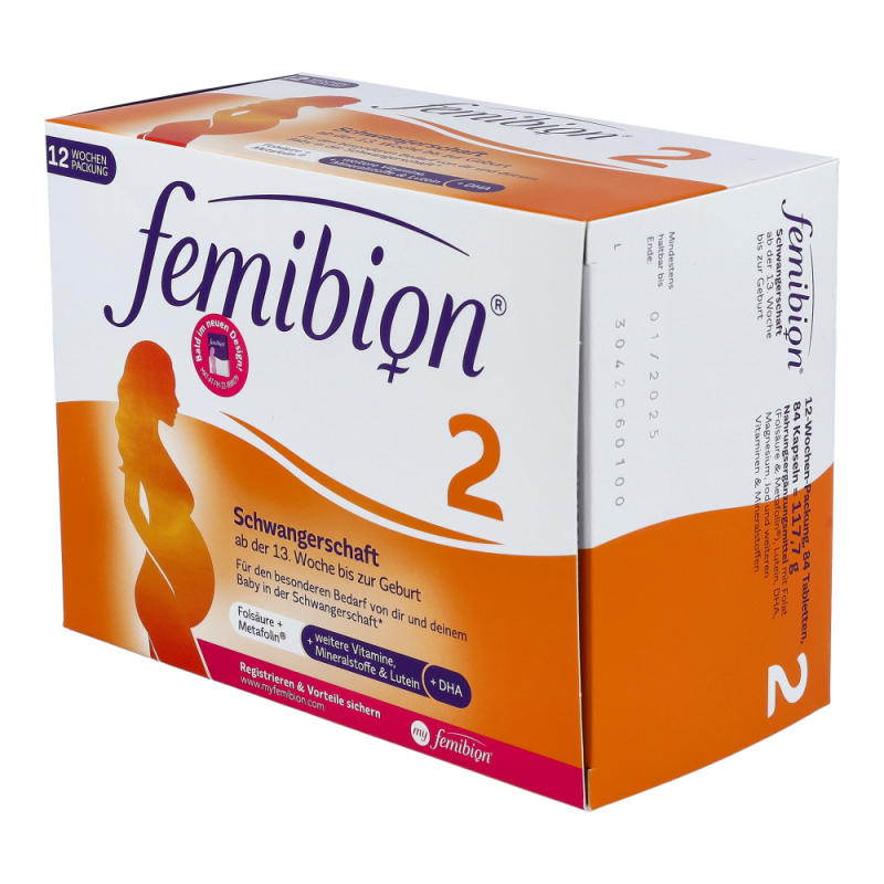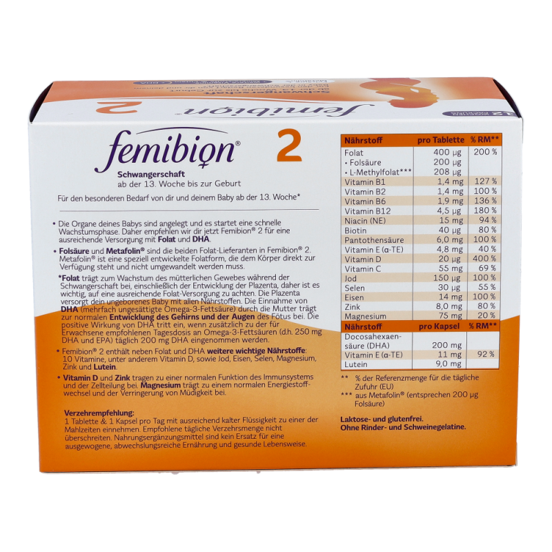 Femibion Schwangerschaft 2 Tabletten + Kapseln liefern wertvolle Nährstoffe und Omega-3 Fettsäuren, um dem erhöhten Nährstoffbedarf während der Schwangerschaft gerecht zu werden. Femibion versorgt Ihren Körper und den Ihres Ungeborenen mit lebensnotwendigen Vitaminen und Mineralstoffen. Die zusätzlichen Kapseln mit Omega-3-Fettsäuren unterstützen eine optimale kognitive Entwicklung.