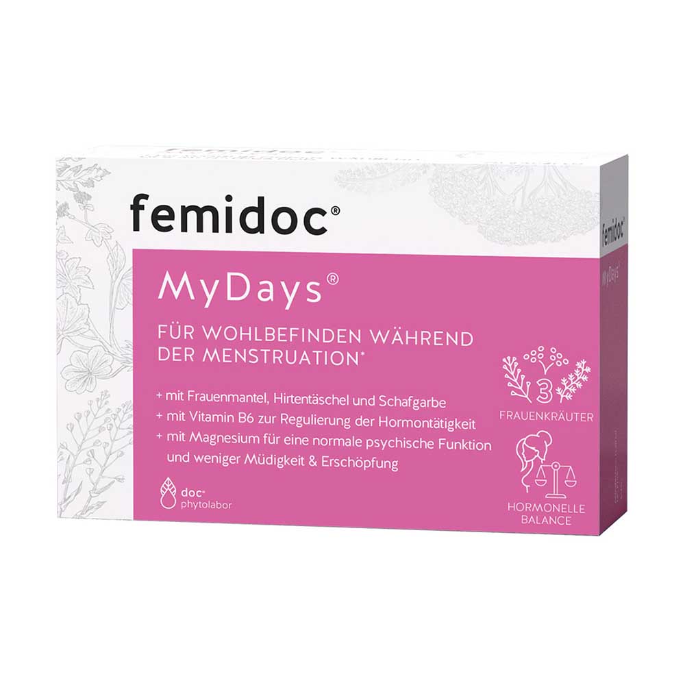 femidoc MyDays ist ein Nahrungsergänzungsmittel mit Pflanzenextrakten, Vitamin B6, Vitamin D, Vitamin E und Magnesium. Für Wohlbefinden während der Menstruation