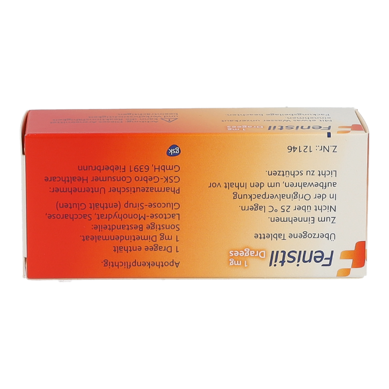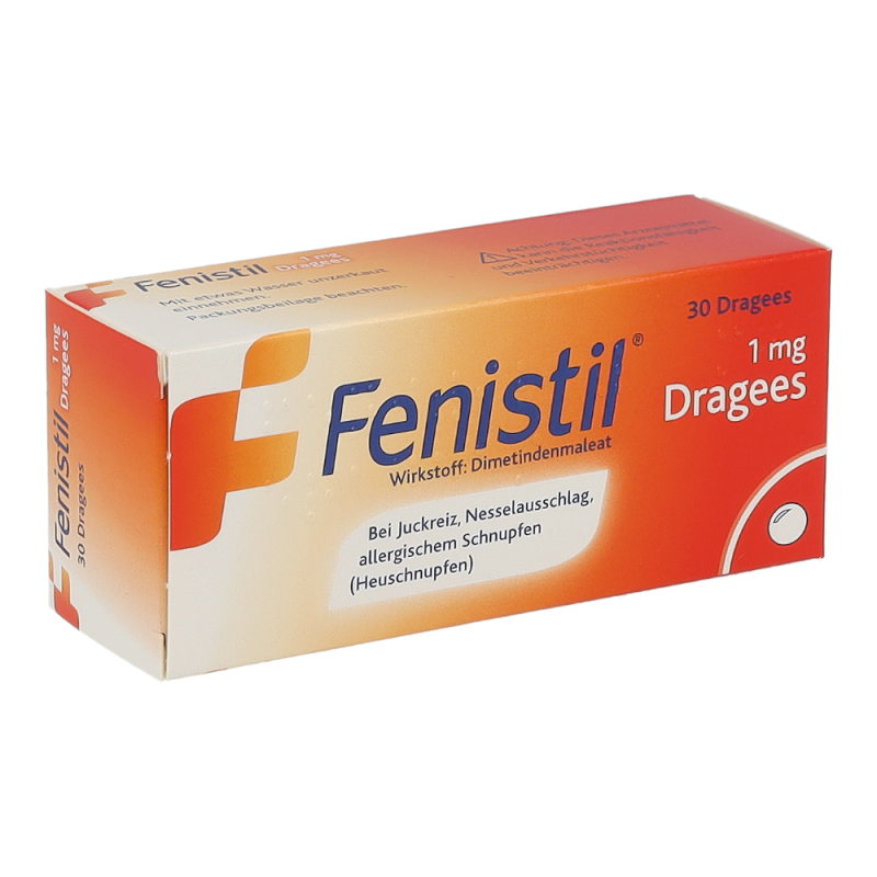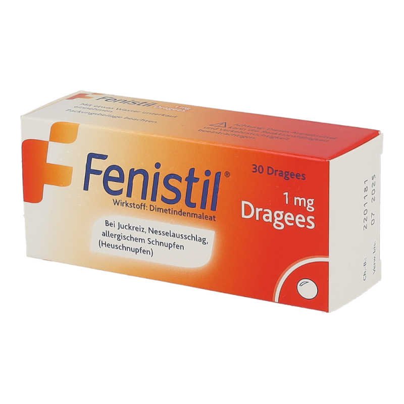 Fenistil Dragees – ein Antihistaminikum zum Einnehmen bei Beschwerden aufgrund von Allergie sowie Niesreiz und Juckreiz verursacht durch z.B. Ekzeme, Insektenstiche oder Kinderkrankheiten wie Windpocken. Das Produkt ist geeignet für Kinder ab 12 Jahren.