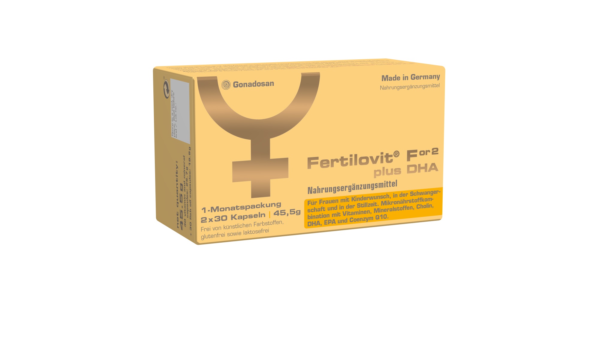 Fertilovit® F or 2 plus DHA ist ein Nahrungsergänzungsmittel, das speziell auf die Bedürfnisse von Frauen vom Kinderwunsch bis in die Schwangerschaft und Stillzeit zugeschnitten ist. Neben einer Rundumversorgung mit wertvollen Vitaminen und Mineralstoffen enthält es 140 mg Cholin und 200 mg DHA.
