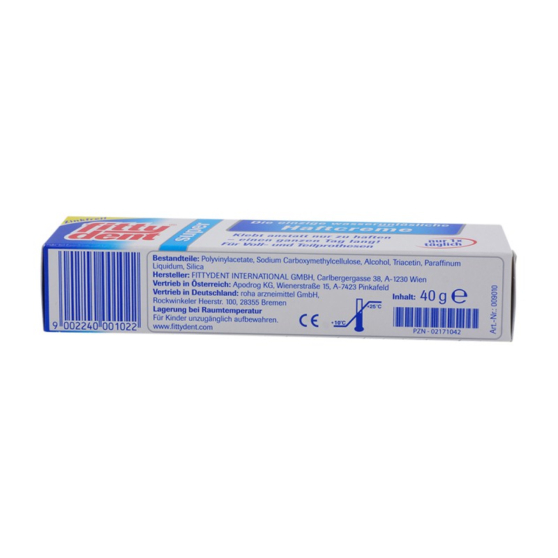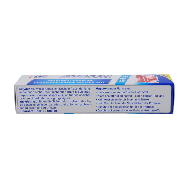 Fittydent Super Haft-Creme ist weltweit die einzige wasserunlösliche Haftcreme. Das bedeutet, dass fittydent beim Essen und Trinken nicht ausgespült wird. Mit extrem starker Haftkraft wird die Prothese den ganzen Tag sicher fixiert. Sie werden ein komplett neues Zahnprothesengefühl erleben.